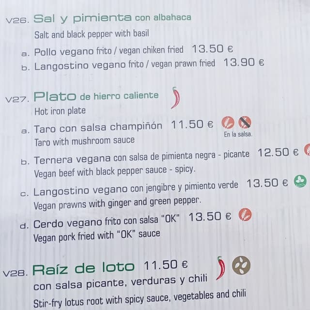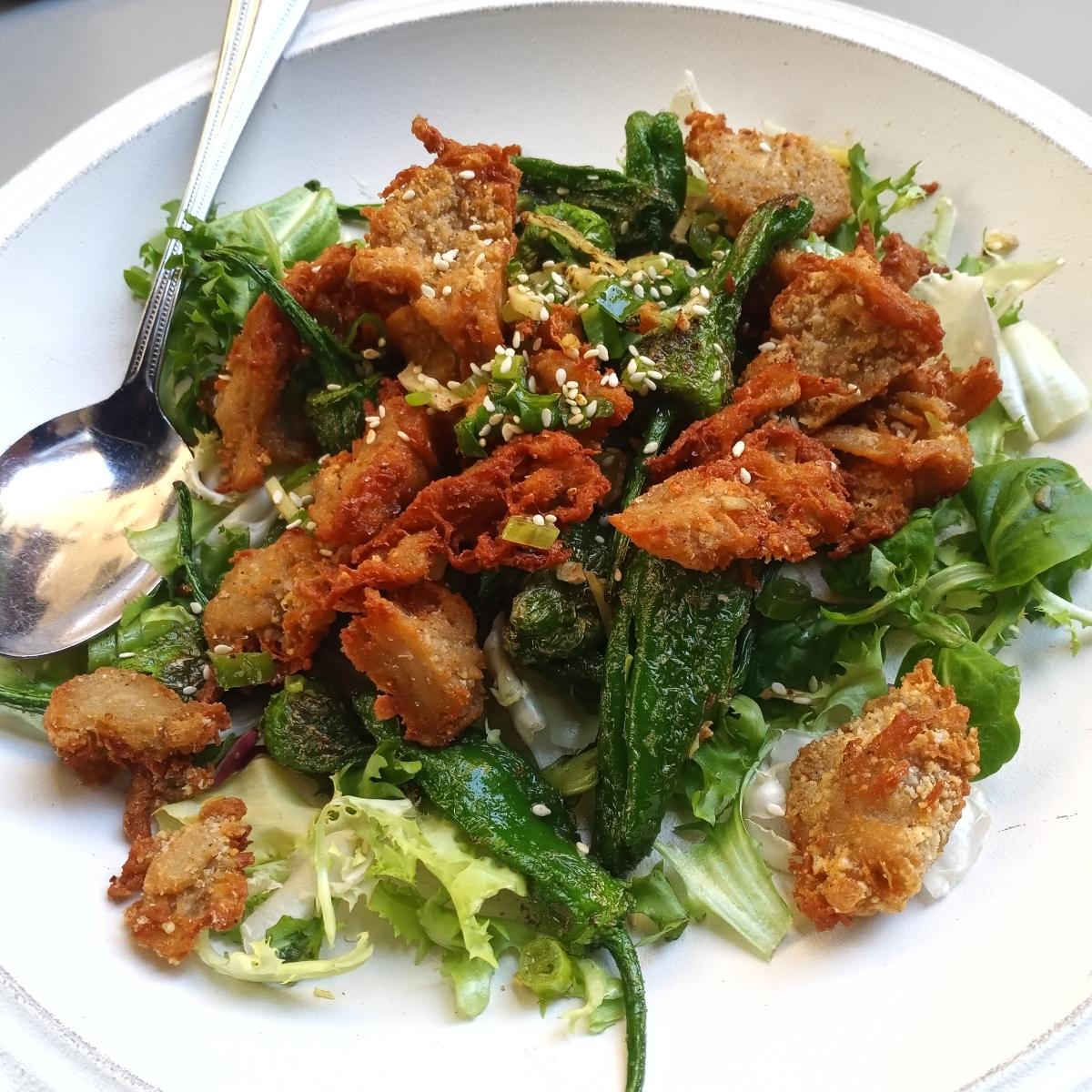 Ensalada "Sal y Pimienta con albahaca" con No-pollo vegano frito y pimientos del padrón. Un plato altamente recomendable, no solo por estar muy rico, el no-pollo frito está espectacular, sino porque ningún pollo tuvo que ser asesinado y descuartizado para elaborarlo. Elegir muerte y sufrimiento, sobre todo teniendo estas alternativas, es cuanto menos, poco ético y poco empático.
