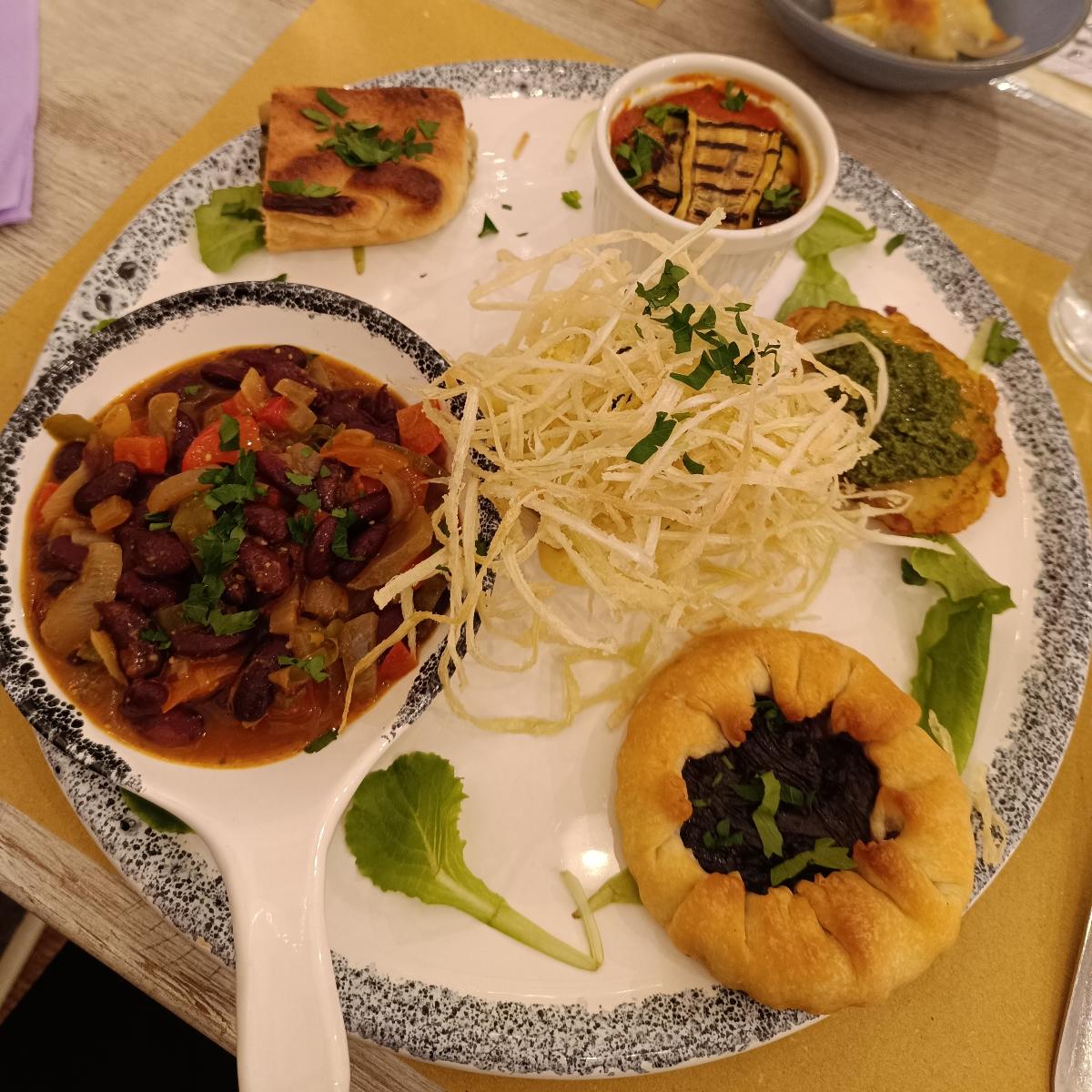 La super tavolozza dello chef, questa volta: chili di fagioli rossi 🥰, quiche lorraine con cipolle rosse 🤩, flan di zucca e funghi (volo!!), Rosti con pesto 🫶🏻, strudel valdostano e terrina con zucchine ripiene al sugo ❤️