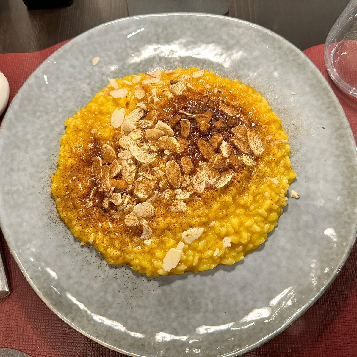 Fantastico riso alla zucca. In questo locale propongono vari piatti tipici della tradizione Italiana. Questo risotto in versione vegan non ricordo di quale zona d’Italia sia ma quello che so è che è stato buonissimo, servito con scaglie di mandorle e polvere di liquirizia che lo rende innovativo e particolare.