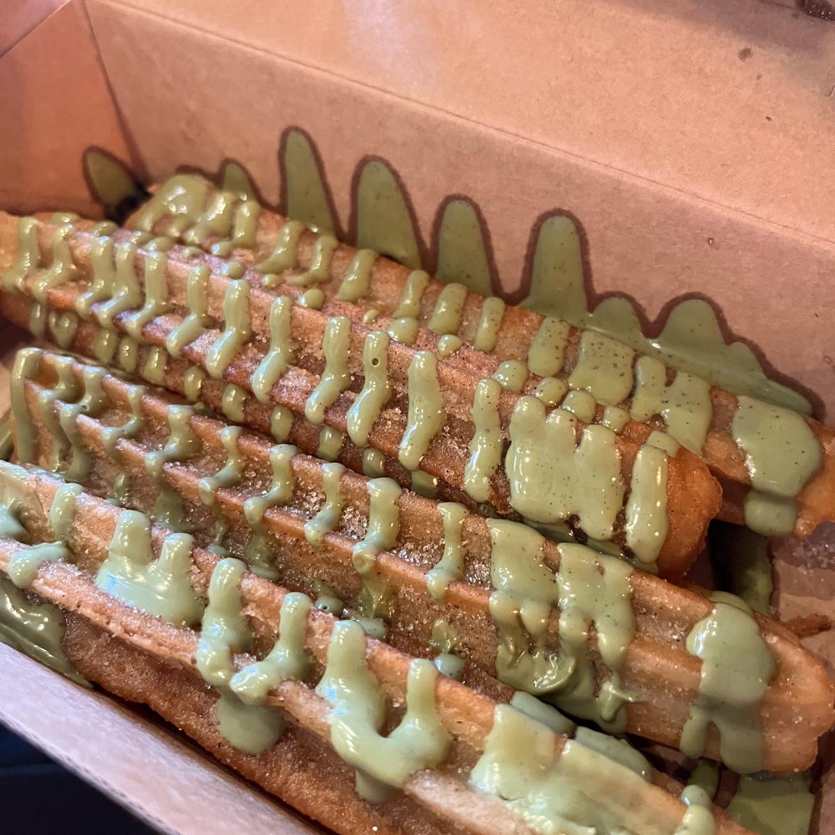 Los churros son lo que te puedes esperar, bastante aceitosillos pero crujientes. Están ricos. La crema de pistacho es una especie de chocolate blanco bastante suave.