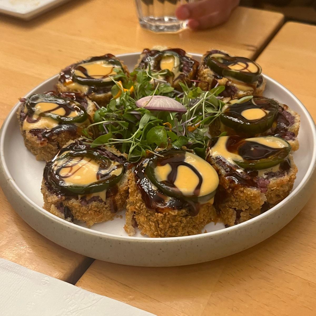 avocado inside and was drizzled in a sweet shoy and spicy aioli pickled smoked jalapenos.