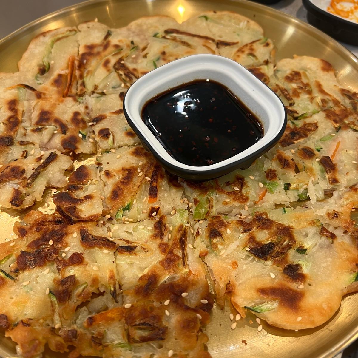 A very crisp vegetable pancake 🥞 that was served with a fairly thick, slightly sweet sauce.