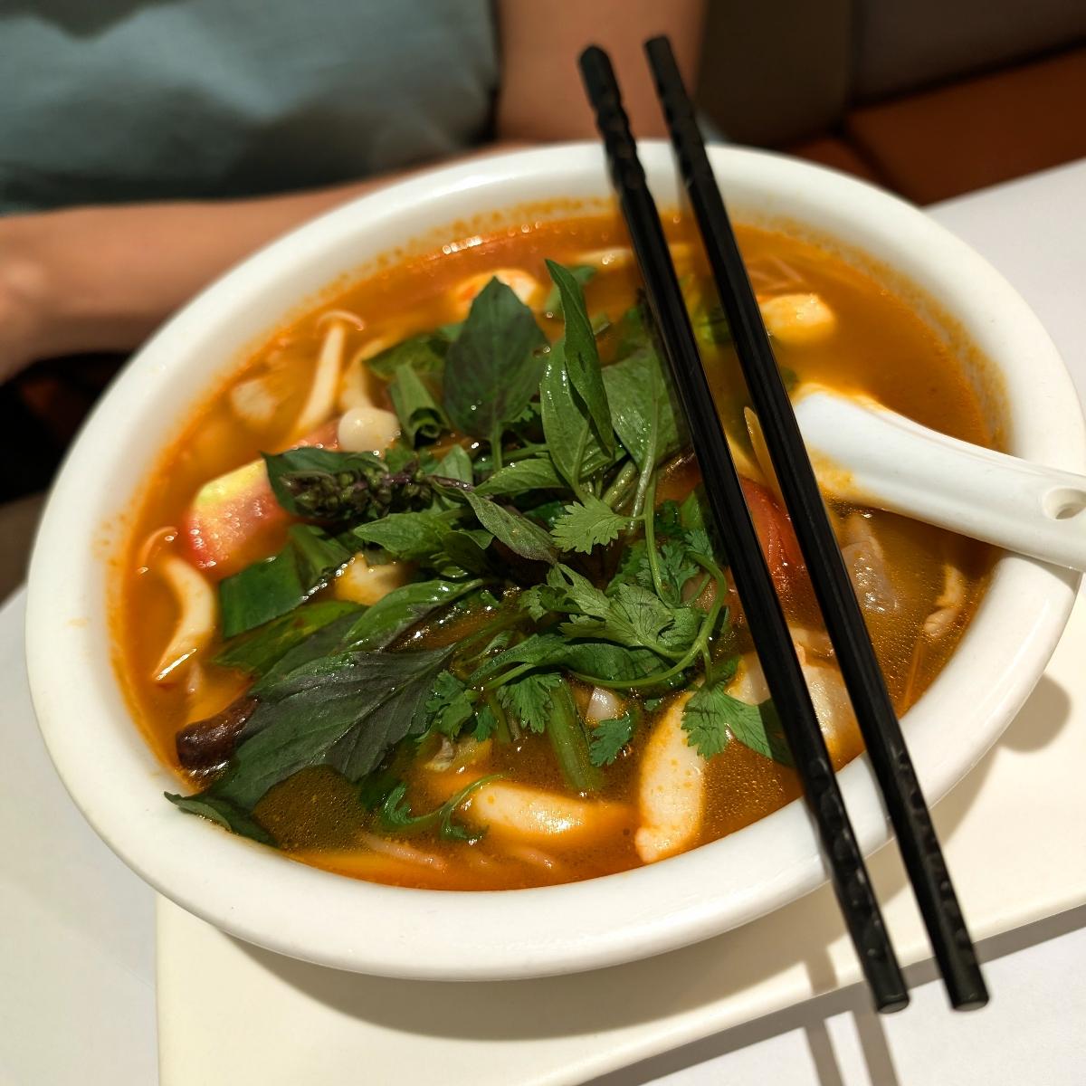 Decently tasty #tomyam #soup with no shortage of #shimeji #mushroom, #veganshrimp, or #evilweed 😏 Good, strong sourness to it, with the #lemongrass and #galangal both given starring roles 😋 We'd had the rice version of this before, now it was the turn of the #noodles / #beehoon 🙂 Fwiw I've always thought of tom yam as a noodles pairing