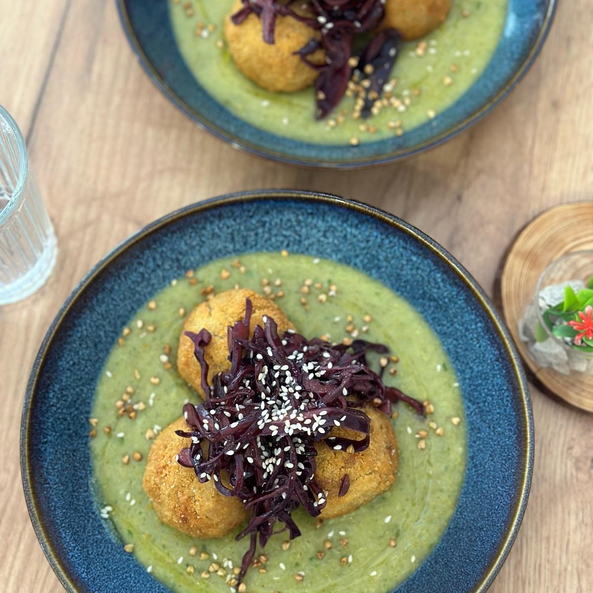 Very filling dish, pumpkin balls on a creamy broccoli soup, with marinated cabbage on top. Very good!