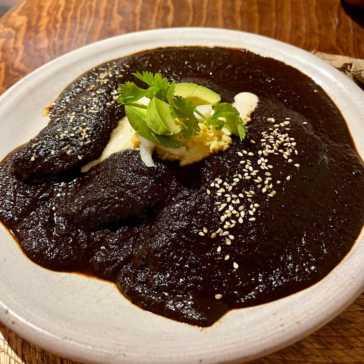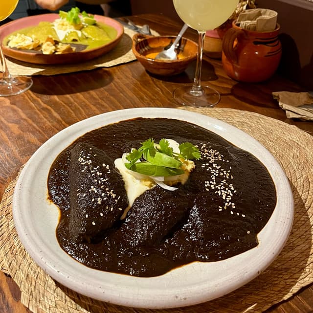 Estás enmoladas de mole negro van rellenas de plátano macho decoradas con crema y queso vegetal y ajonjolí. Estuvieron ricas pero me cayeron muy pesadas, sentí el mole muy espeso y picoso y esta vez no las disfruté tanto como las veces anteriores, ni me las pude terminar 🥹 pero bueno, a lo mejor tuve mala suerte, para la siguiente mejor pediré las enmoladas pintas que te ponen 1 enmolada de cada una de los moles que tienen 😅 #veganproud #veganmole #mexicovegano #govegan #sinoesveganonoescomida