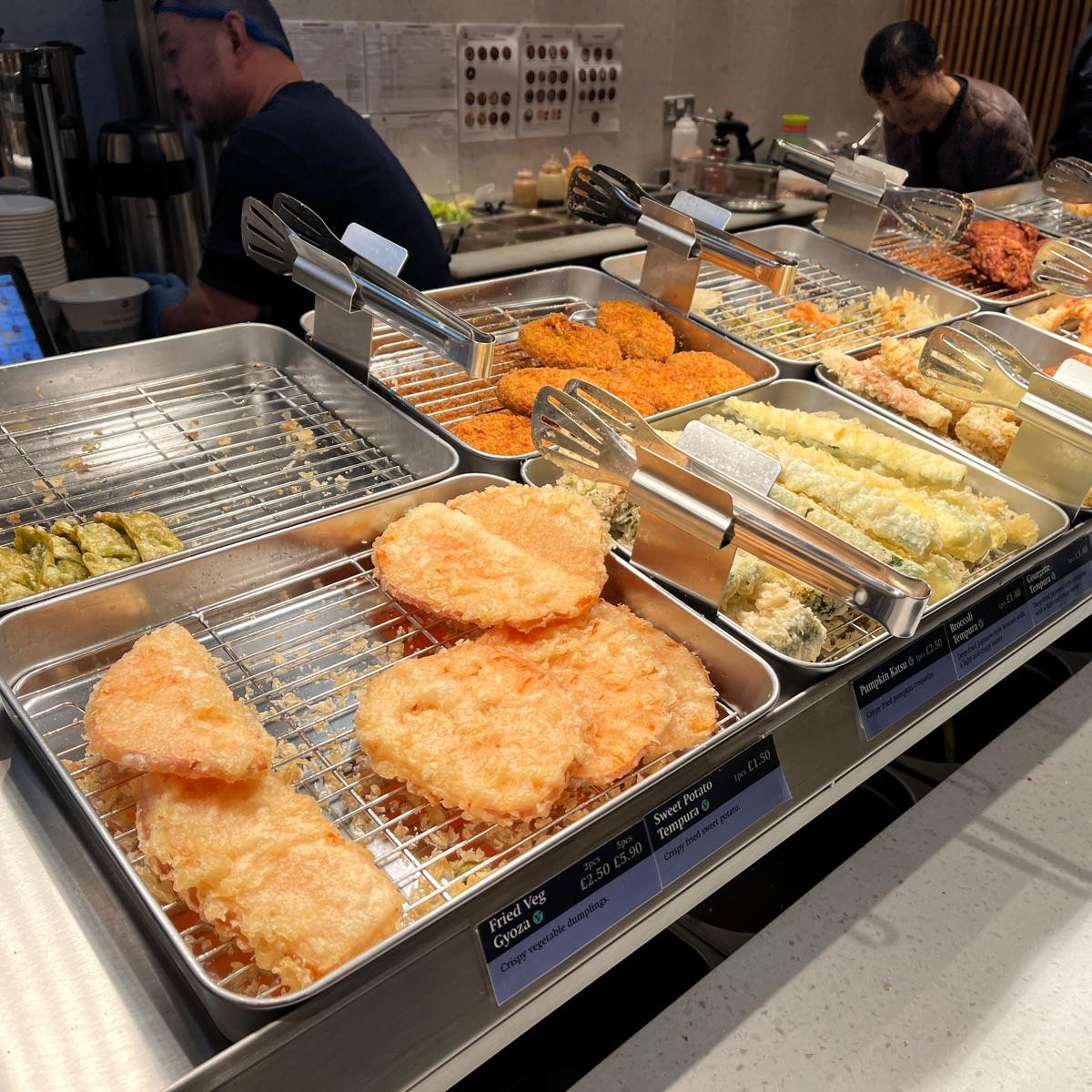 🇯🇵🍠 Half the #tempura here is vegan🌱, woo hoo! You order main dishes at the self serve kiosk and take your ticket but tempura you just help yourself to what you want and they charge you at the till with your ticket. This #sweetpotato tempura was nice and #sweetdreamsaremadeofgrease. My partner suggested the tempura needed more seasoning but I thought it was ok. Often they are putting the tempura on top of noodle or rice dishes where there will be more seasoning too. It feels a luxury to have #vegantempura on Wimbledon Broadway and so cheap. Spoiled. #japanese #veganproud #veganlondon #londoneats