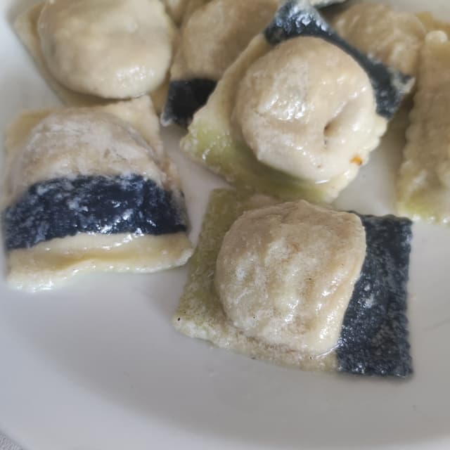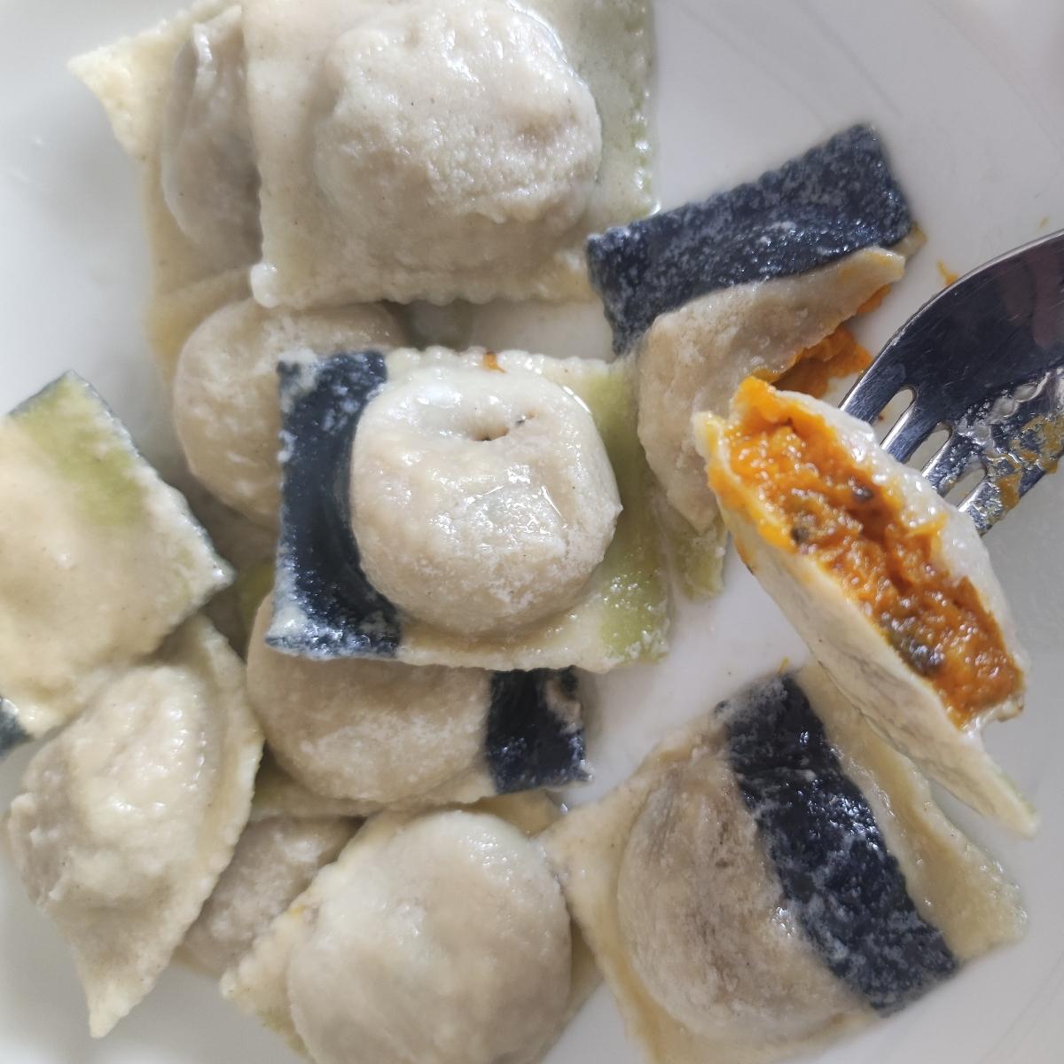 La masa es siempre perfecta, pero este relleno no es de mis preferidos. La calabaza invade mucho, solo se siente ese sabor. Los hongos de pino yo ni los noté. Entonces queda un relleno de puré y yo prefiero más textura, más densidad. El sabor general es rico, pero no los elegiría habiendo otros tanto mejores.