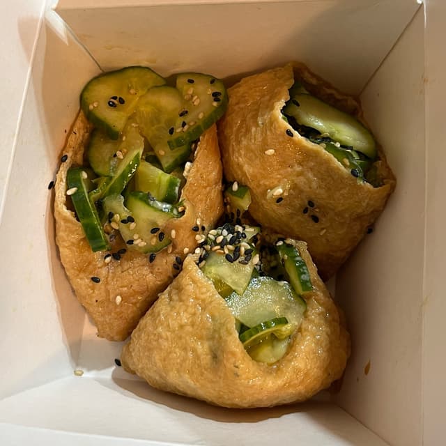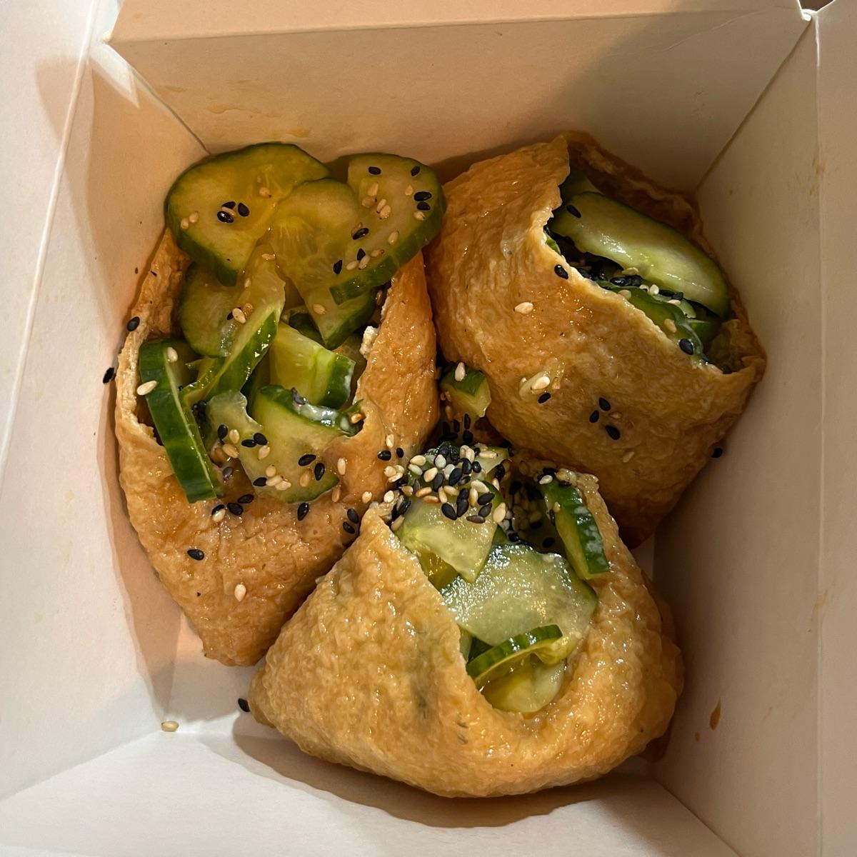 Tofu skins filled with sushi rice, cucumber salad and sesame seeds. Happy happy maki #maki #satay #tofu #sushi