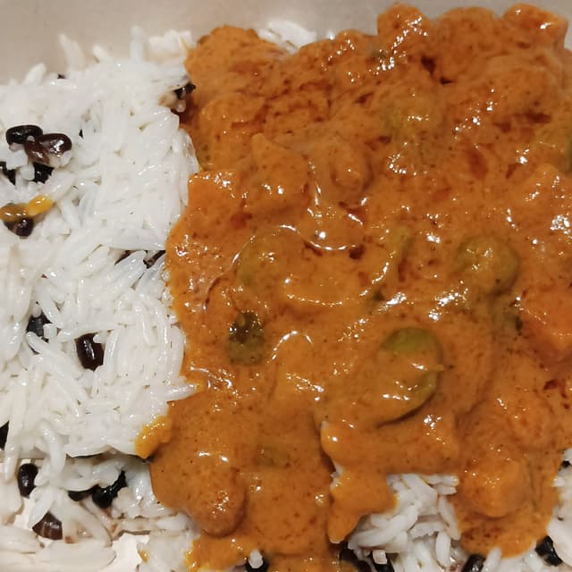 Mix of basmati and black rice with aromatic & flavoursome coconut and cashew-based vegetable curry sauce!! Super delish and quick. Comes with a compostable sugarcane bowl. Pictured: sauce on rice prior to heating. Purchased for $2.75 ish on half-price, Woolworths. #curry #masala #rice #readymeal #indianfood