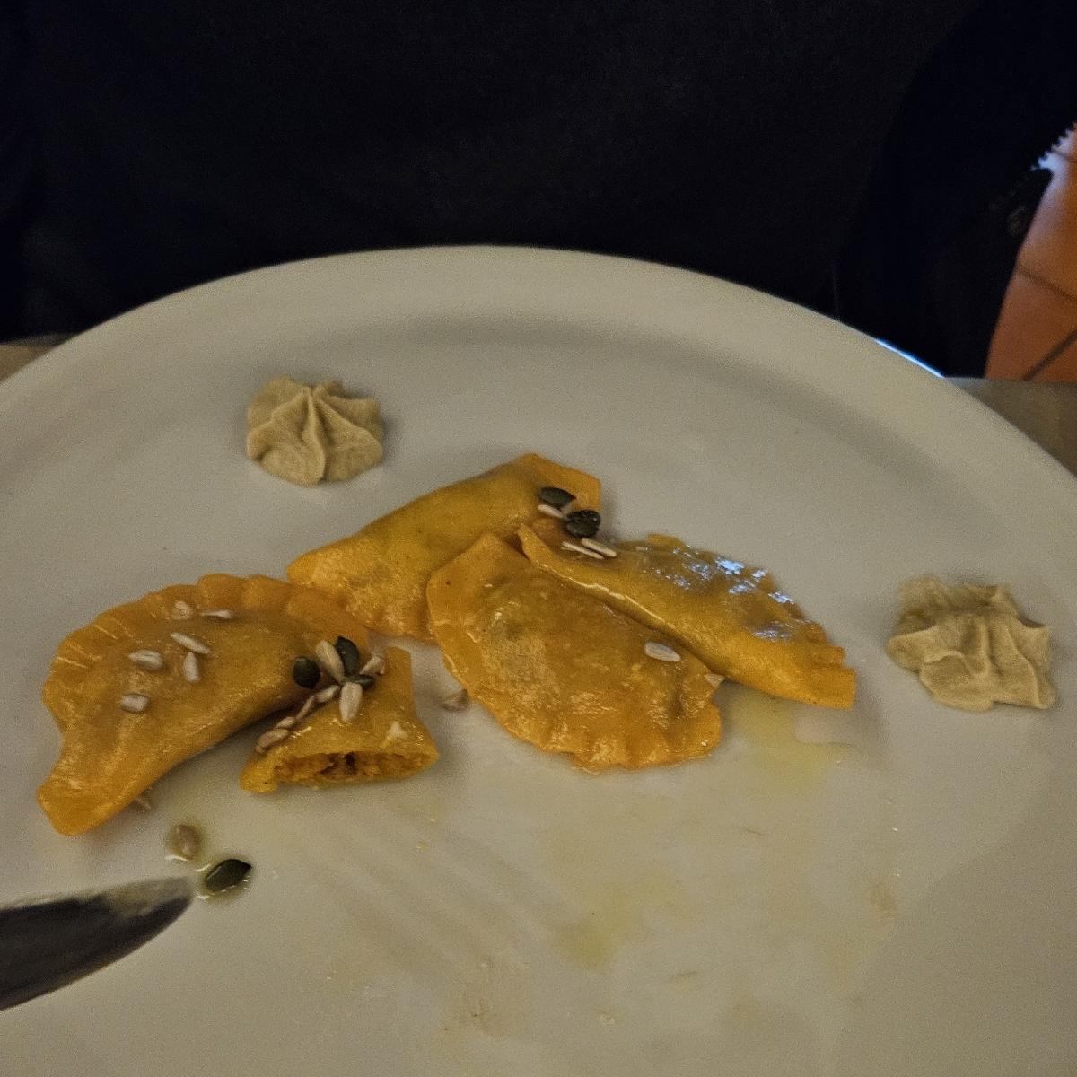 La pasta era fatta con una farina un po' grezza. Il ripieno invece era molto buono e cremoso, anche se un po' tanto dolce essendoci gli amaretti.