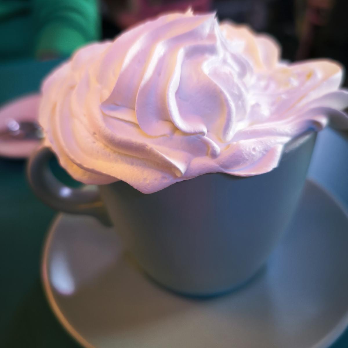 Mi café para las celebraciones. Muy vistoso. Lleva nata vegana muy rica, pero llena mucho, menos mal que el café es ligero. Yo le añadiría unas virutas de chocolate en la nata jjjj