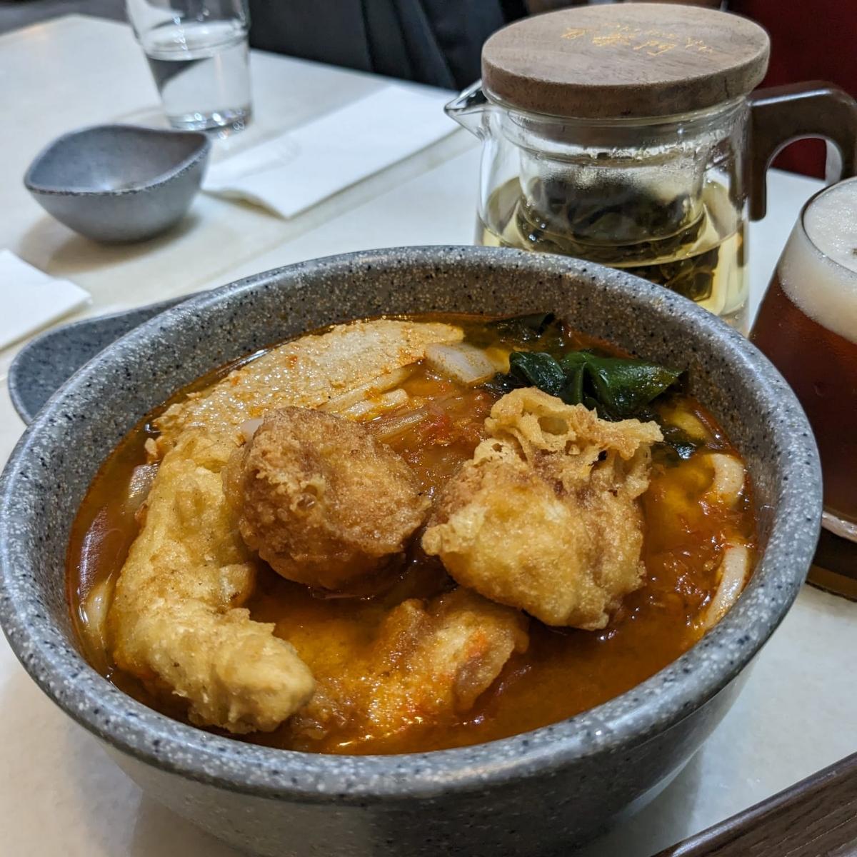 Comforting soupy udon with slight spice to it along with mock meats for presentation and texture. Good for a cold and rainy day
