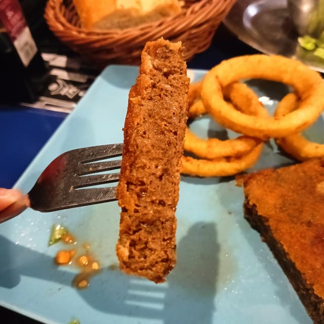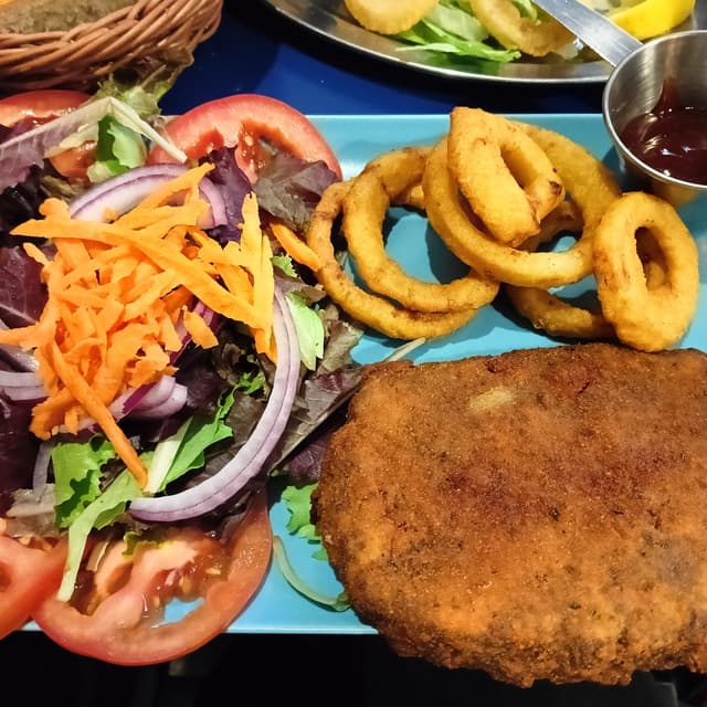 🍲 Plato combinado de escalope de seitán empanado. Estaba crujiente por fuera y muy blandito por dentro. El sabor estaba muy rico. De guarniciĂłn se podĂa elegir entre patatas, pimientos a la plancha o aros de cebolla, que fue lo que elegĂ. Los aros eran crujientes por fuera. De acompañante se podĂa pedir ensalada o hummus, donde elegĂ la ensalada, que tenĂa zanahoria, tomate, cebolla y hojas.