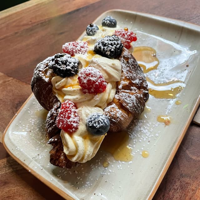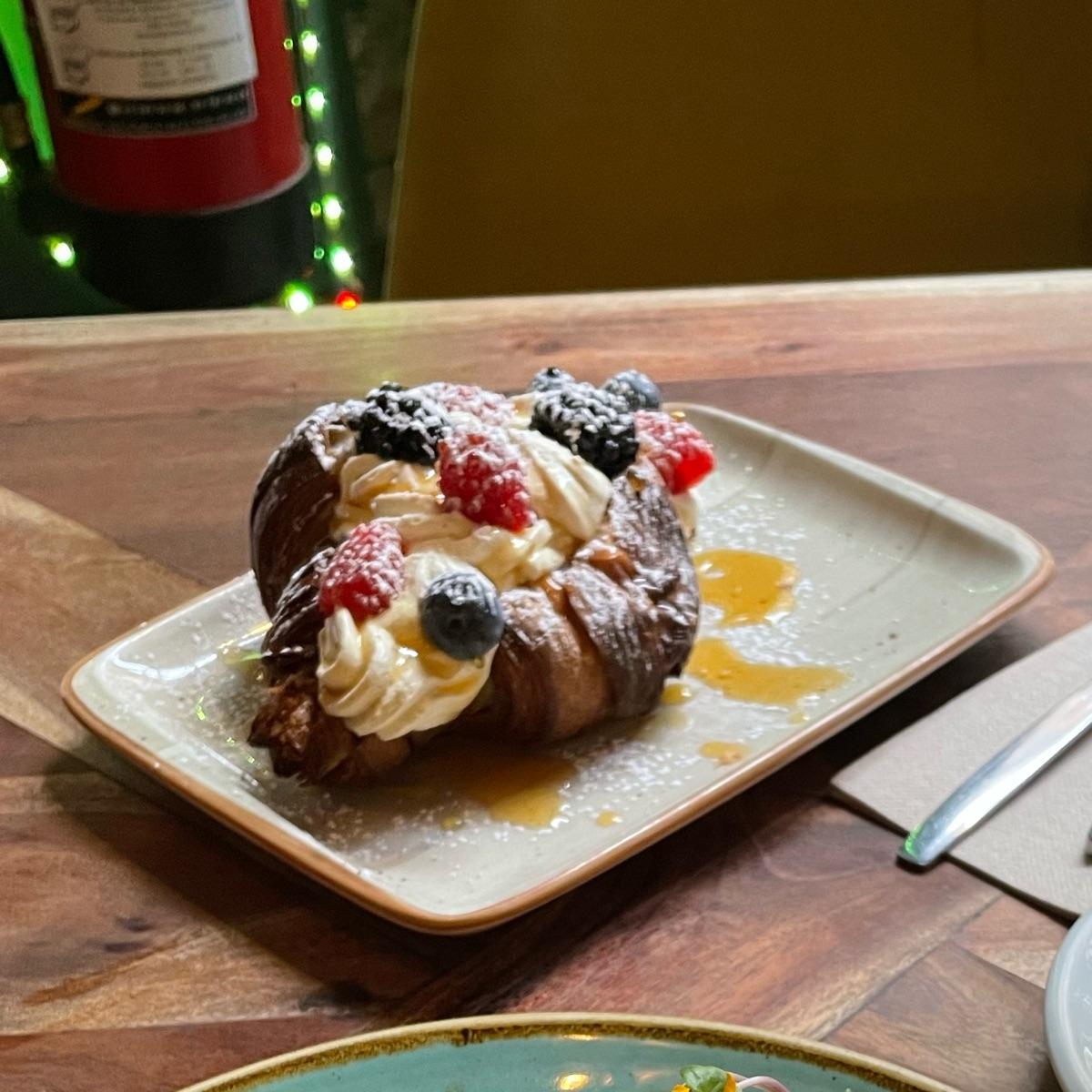 Croissant blanc relleno de ganache de vainilla de Madagascar y chocolate blanco con frutos del bosque frescos, de la carta de Desayuno/Brunch, del Restaurante Distrito Vegano.