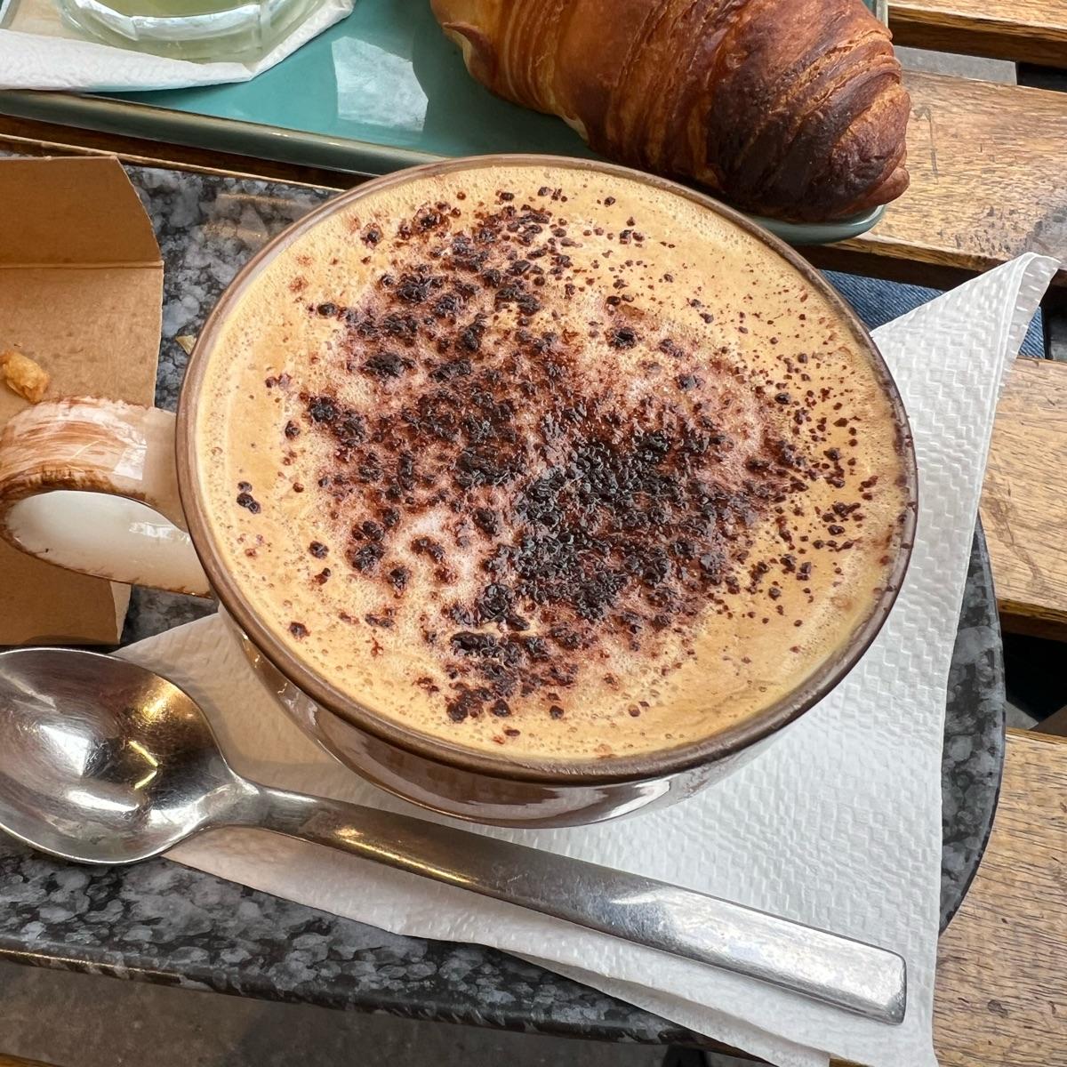 Cappuccino com leite de amêndoas, bem doce e saboroso.