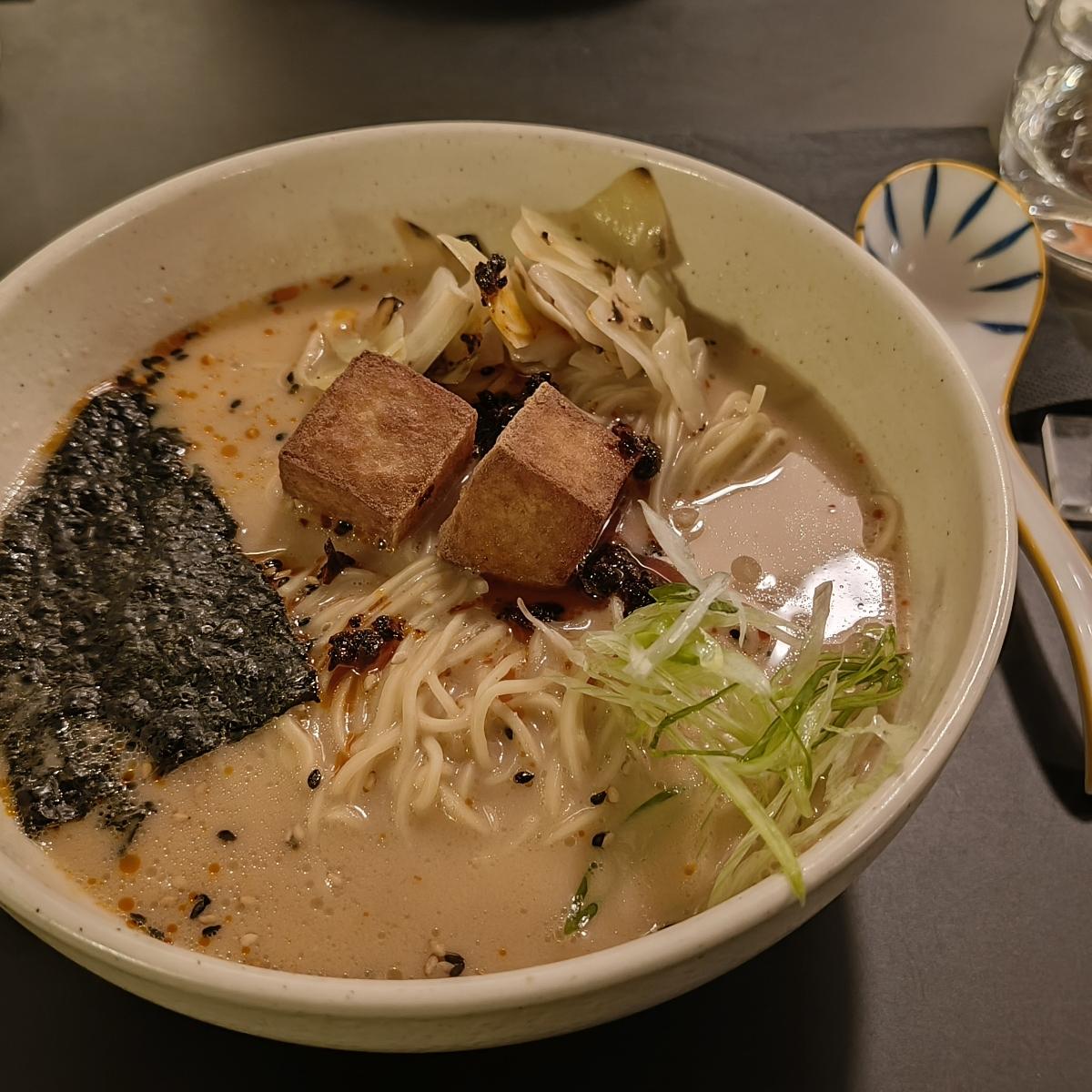La cosa meno entusiasmante del piatto è il tofu fritto, perché ha poco sapore e si appara giusto se dopo il primo morso lo metti nel brodo.