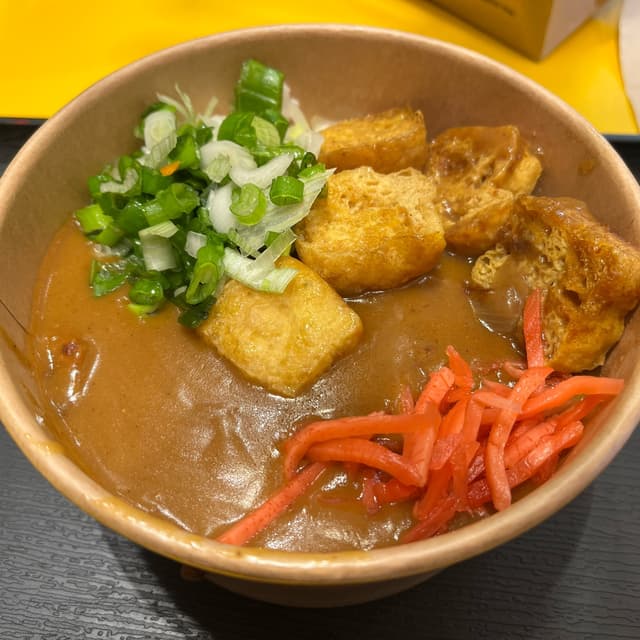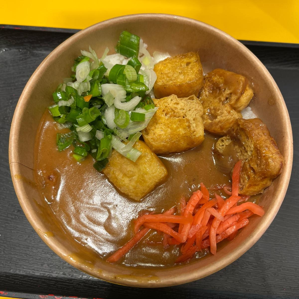 🇯🇵🍛 This #tofu #curry #rice is nice too and I’m pleased it has some protein. It’s classic #japanese curry so very tame. They add some green onion and pickled ginger which is cool. This chain has two pages of very clearly labelled vegan main options plus lots of vegan tempura. I struggle not stopping when I pass. I was tempted to get a pumpkin katsu to add on top but restrained myself. #veganmenu #veganlondon
