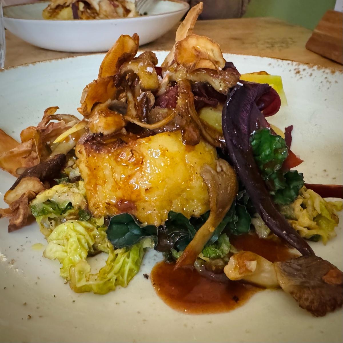 Fermented Sourkout Pofato Cake & Creamy savoy cabbage + Tagliatelle of Rainbow carrots, Pan fried Grey Oyster mushrooms