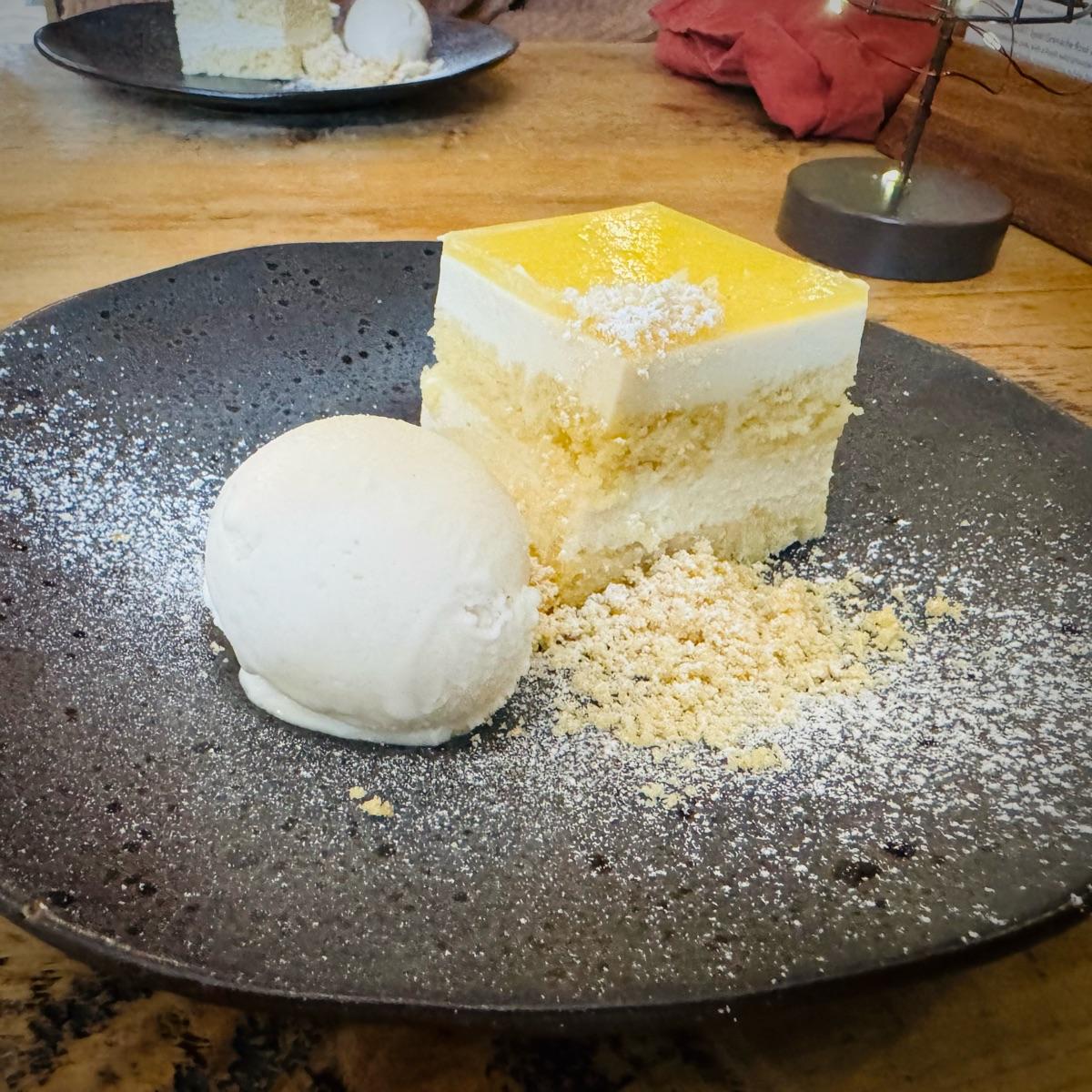 Ginger sponge with Pineapple Set Cream + Dry Biscuit With fermented Rum Cashew yogurt Ice Cream.Beautifully subtle flavours not to sweet but just spoonful’s of deliciousness! 🥰