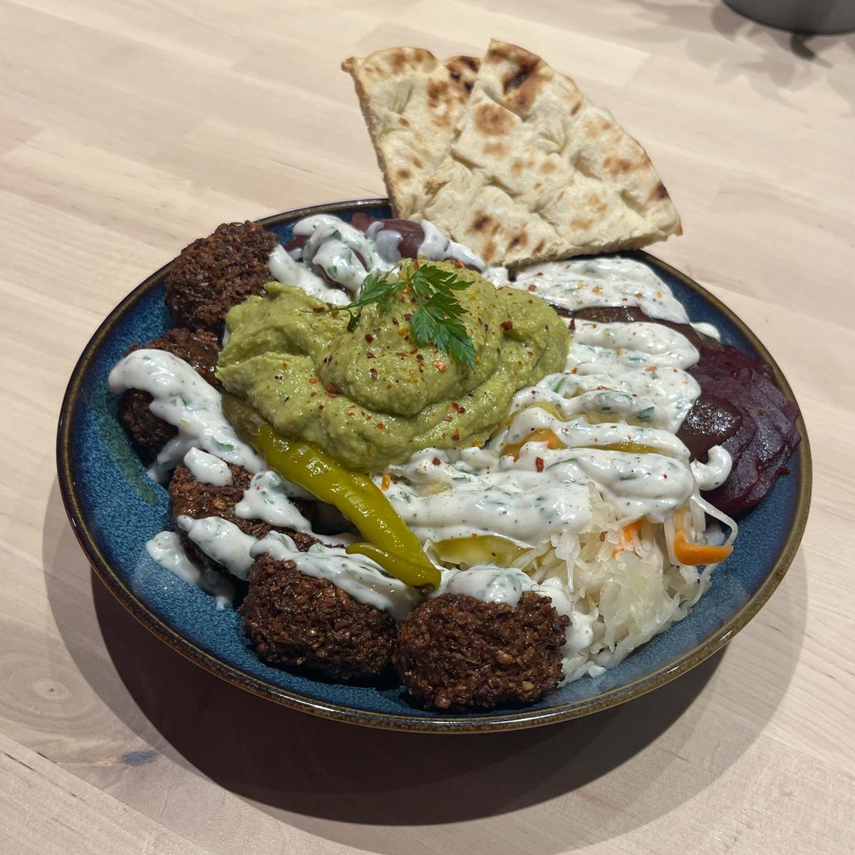 #bowl with hand made #falafels, green hummus, tahini yogurt sauce, kalamata olives, beetroot, shredded lettuce, marinated red onions, sauerkraut, chili paprika, pita bread.