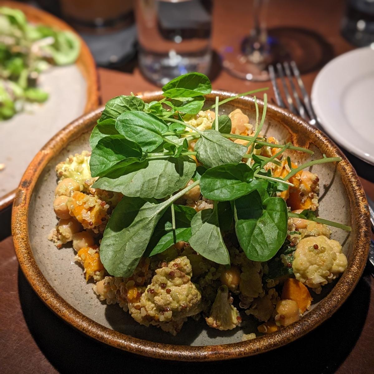 This grain bowl is a filling a nutritious option for a live music venue. It's made of quinoa, chickpeas, smashed and marinated cucumber, roasted squash, and cauliflower dressed in green goddess dressing topped with fresh spinach. Green goddess is such a great dressing flavor. This is a nice creamy dish packed with veggies. It's served cold, so it would be better on a summer night. It didn't quite fit my mood while we listened to Charlie Brown Christmas songs.