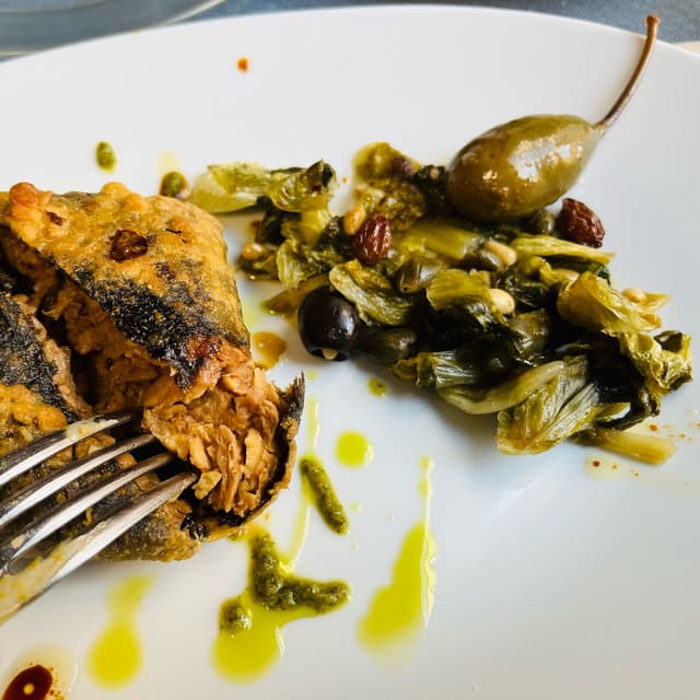 Il buonissimo no fish era accompagnato da un’insalata scarola saltata in padella con capperi (tra cui quello buonissimo gigante in foto), uvetta, olive 🫒 e aglio 🧄 .