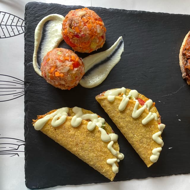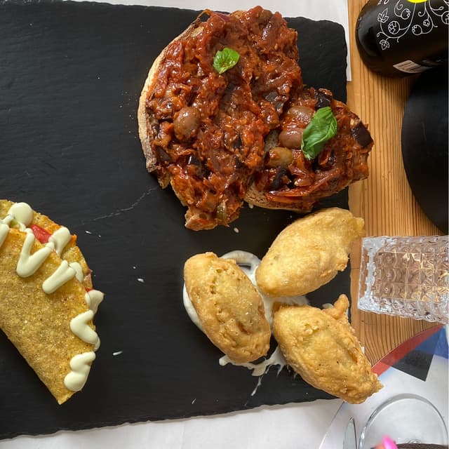 Tortilla di mais con non pollo, crema di fagioli rossi, avocado, pico de gallo, mayo all'avocado, Bruschetta sicula con caponata. In assoluto i due più buoni antipasti di questa estate!