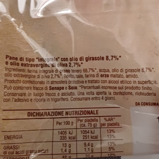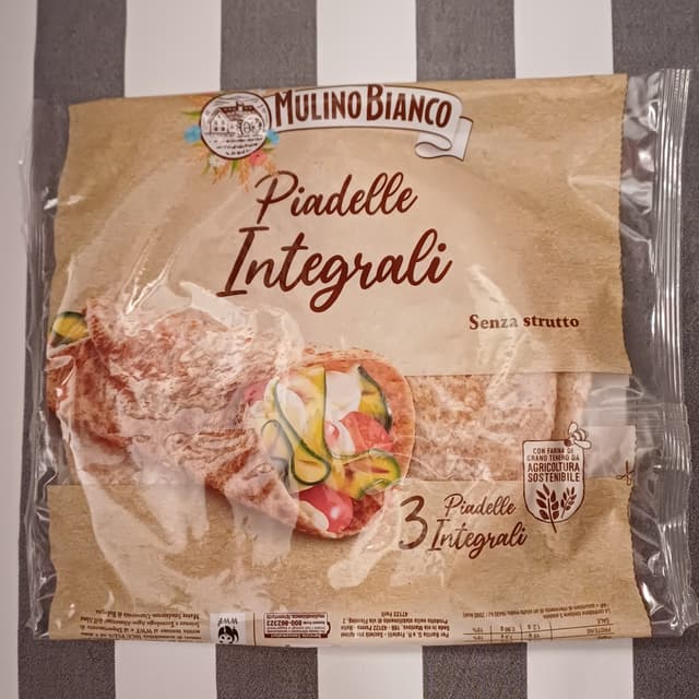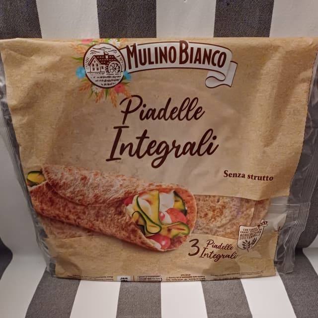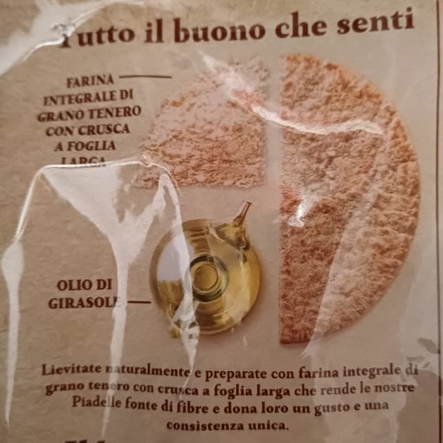 Confezione da 3 piadine fatte con farina integrale di grano tenero con crusca a foglia larga e si sente nell'impasto che risulta lievemente granuloso e leggermente dolce.