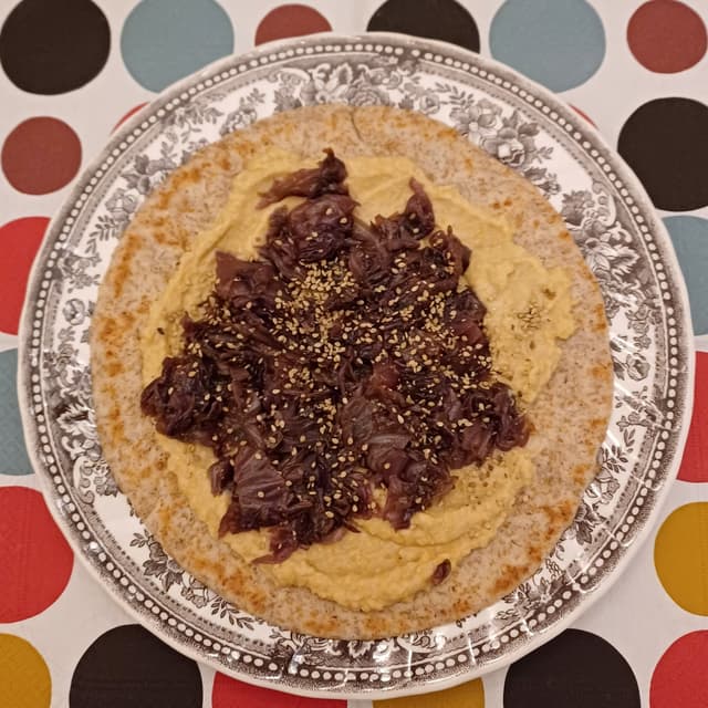 Preparata in forno farcita con hummus e radicchio precedentemente spadellato.