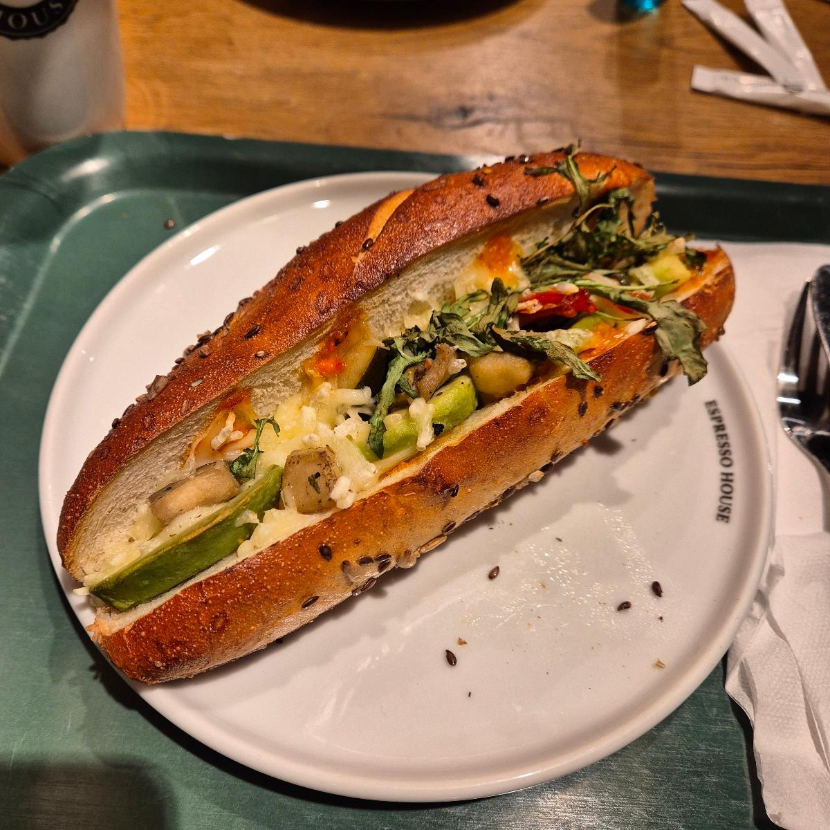 This was so good. It's filled with avocado, grilled veggies, vegan mozzarella and rocket. It's served warm so that's amazing.