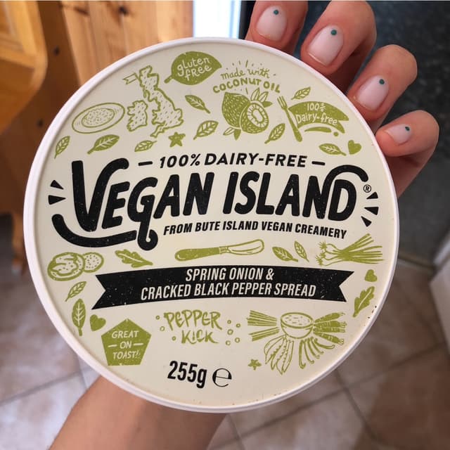 Formaggino vegan tipo Philadelphia con cipollina e pepe nero. A base di olio di cocco e soia (gli ingredienti non sono il massimo, è un prodotto da consumare una tantum). Il sapore è davvero ottimo, come anche il prezzo.