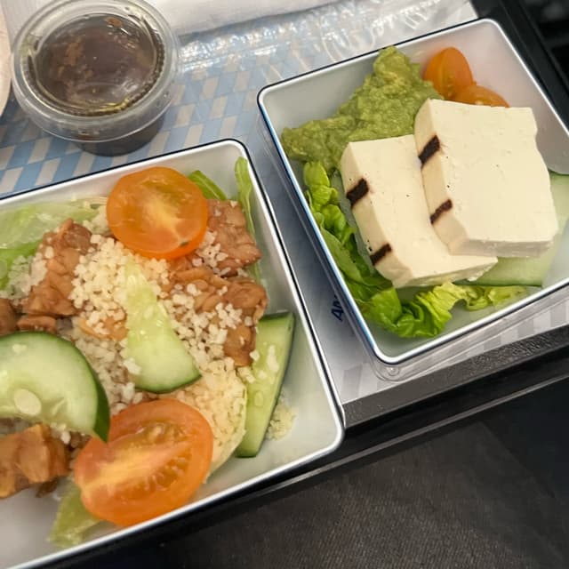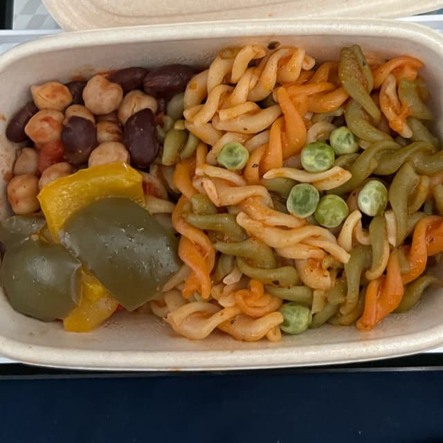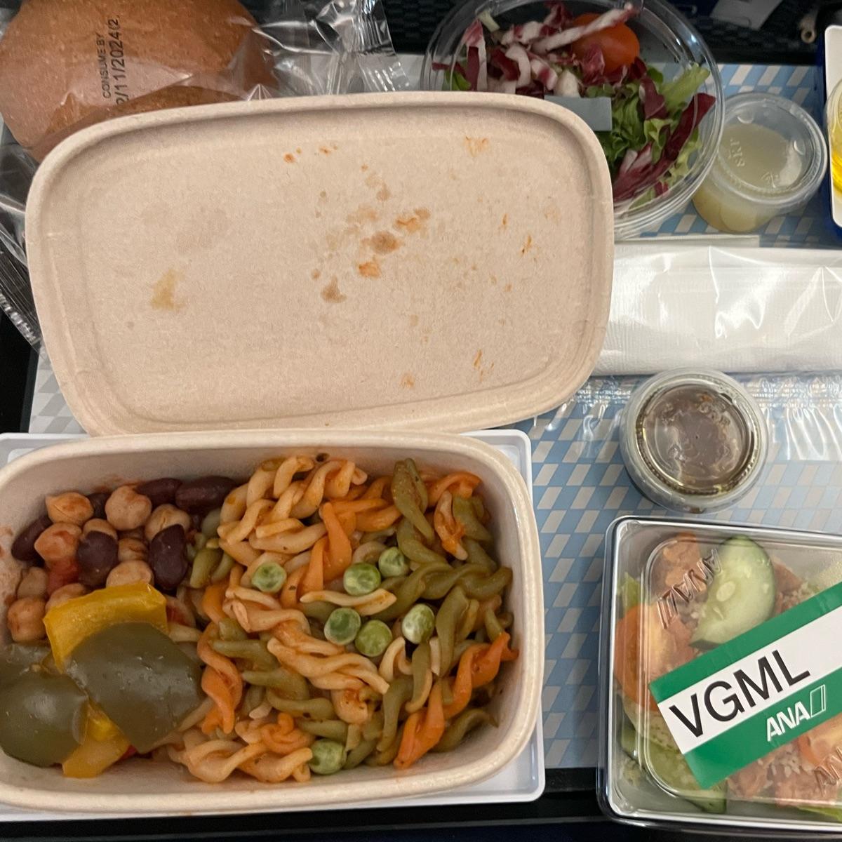 Rather pleasant #vgml inflight meal on board ANA. Delicious pasta with peas, capsicum and beans. Lovely tofu salad on the side. #inflightmeals #veganinjapan
