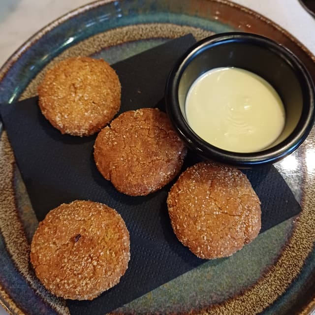 Falafel fritti ma leggeri e morbidi. Sono accompagnati da una salsa di yogurt di soia con erba cipollina che ci sta benissimo con la sua nota saporita e piccantina.