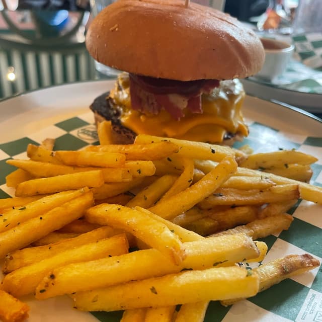 Ingredienti: doppio smash signature patty, cheddar vegano, onion ring, maionese, salsa BBQ, bun di patate.