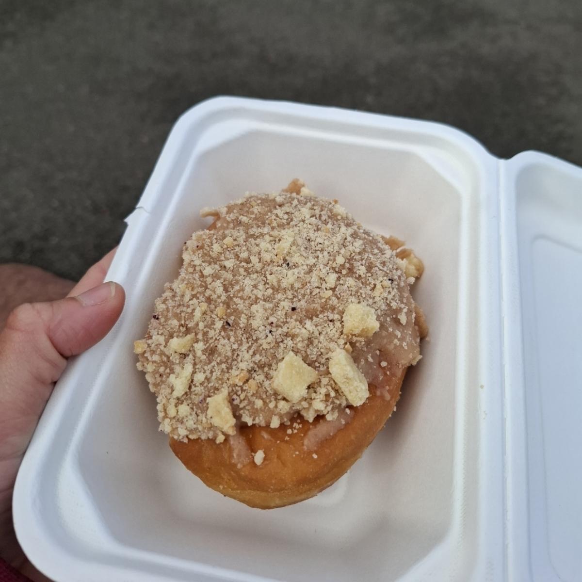 Doughnut farcito con una crema con mele cotte e cannella, decorato con glassa e un crumble di torta. Quando ci sono di mezzo mele e cannella ho sempre aspettative alte e ammetto che qui sono state un pochino disattese: la crema era un pò sciapa, così come il crumble, di cui non ho percepito il sapore. La prossima volta sceglierò qualche variante più zozza 🙃