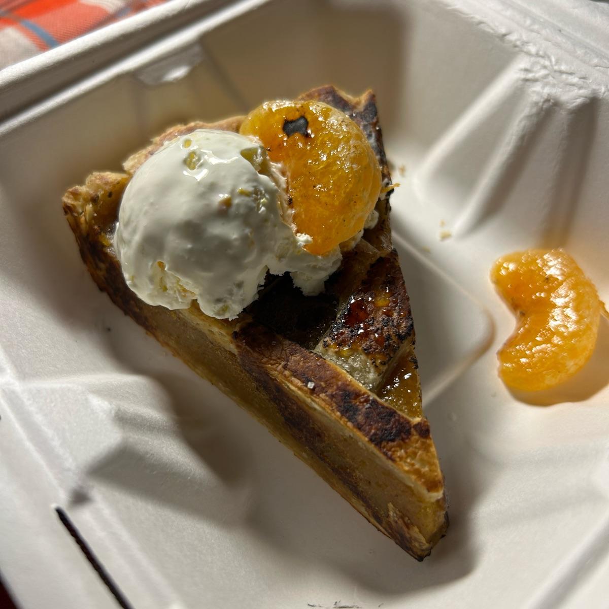 This pumpkin pie was overpriced and just plain bland! It was topped with glazed mandarins and vegan vanilla ice cream, but still bland.