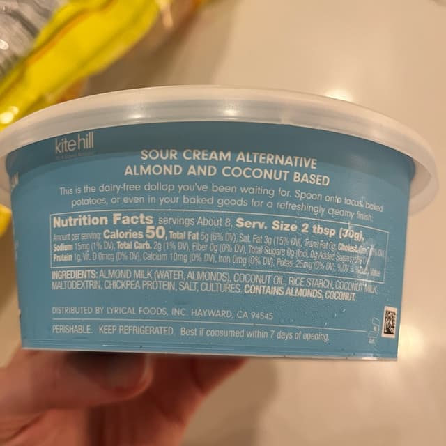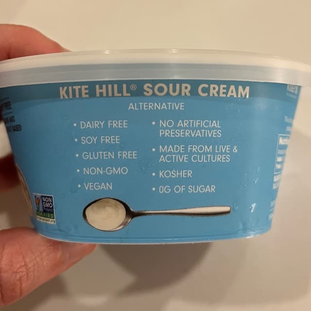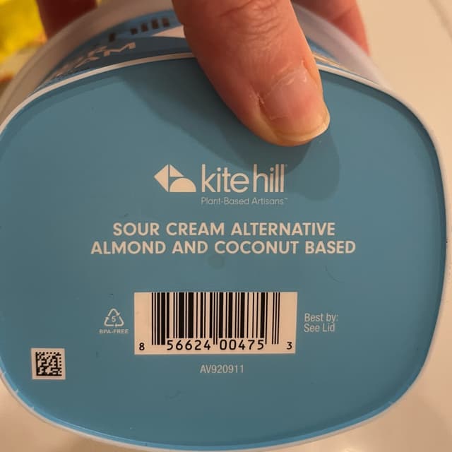 🌮🥔 My mom kindly got us this #sourcream for tacos, baked potatoes, etc. This Kite Hill brand was great and is #glutenfree made from #almondmilk and #coconut 🥥and cultures. It’s not the healthiest as there’s too much saturated fat. It has chickpea protein in it which is cool.