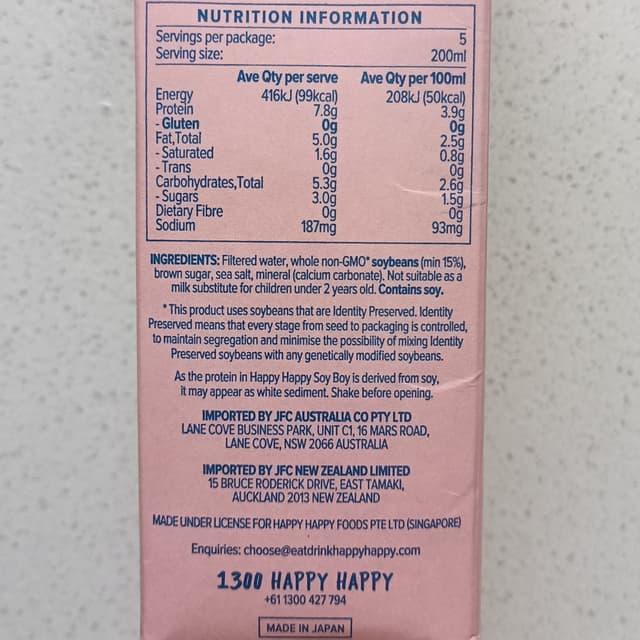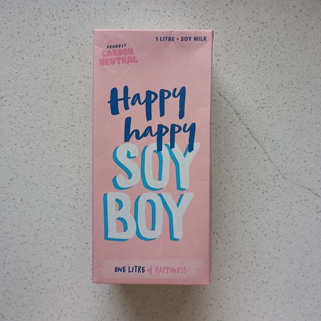 Lightly sweet, protein and calcium containing milk. No screw cap lid - snip the corner of a carton to make an opening. This carton seemed better designed and did not lead to slow leakage inside the fridge! #soymilk #mylk