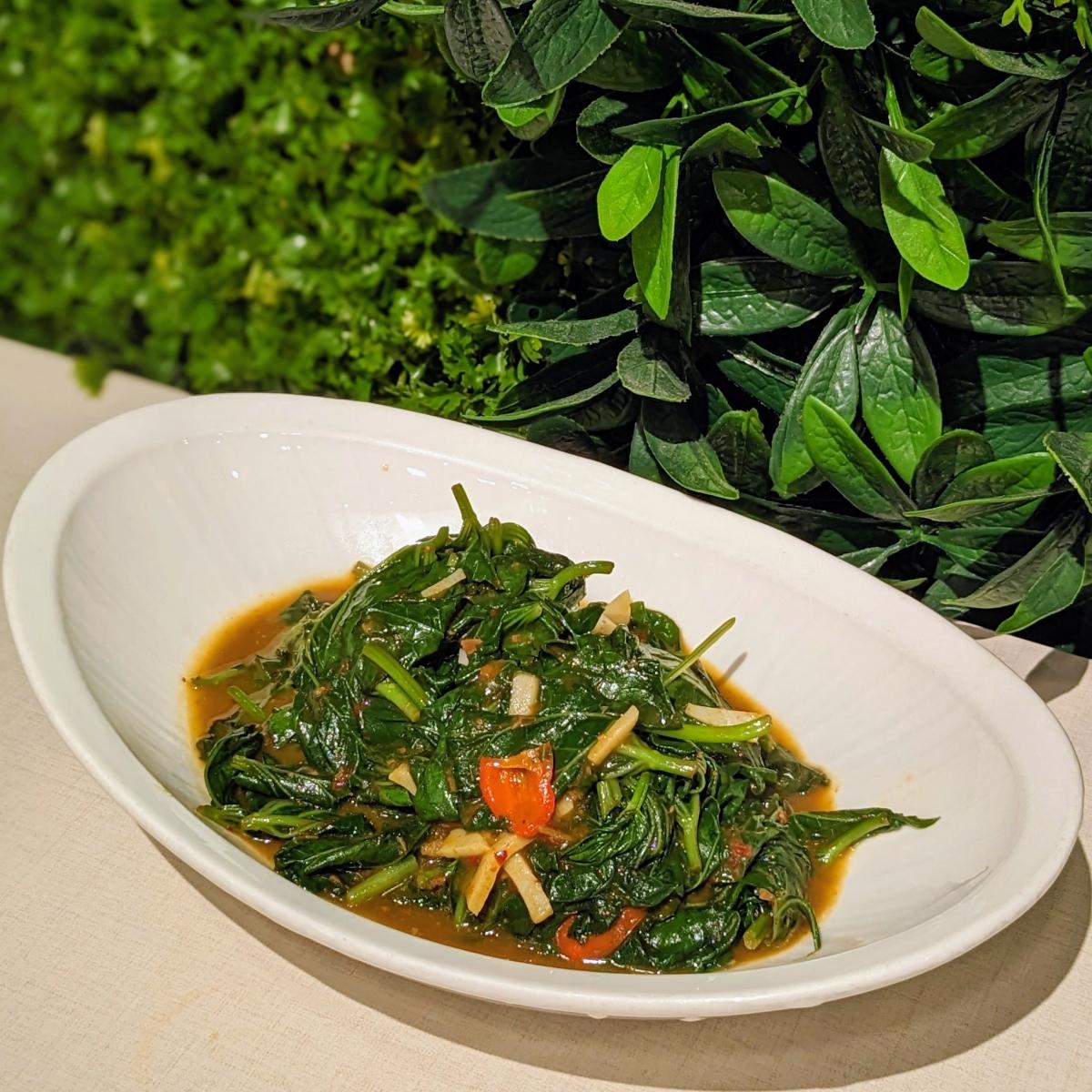 Generous pile of sweet potato leaves and strips of konjac 'fishball', sautéed in a tangy and mildly spicy sauce that kinda reminded me of asam. 🥬🌶️ Personally found the 'fishball' slightly random ahaha but it provided some variety! (Allium-free, $10) #sgvegan #chinesefood #alliumfree