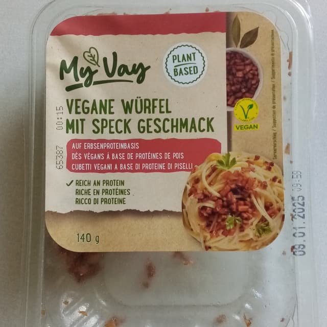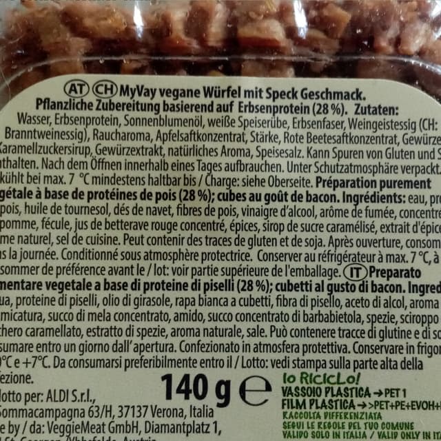 mah, non mi ha convinta tantissimo, cubettata di #fakemeat al sapore speck e wurstel affumicati, probabilmente adatta a torte salate o sugo carbonara... non è il genere di prodotto che mi manca in cucina, non credo lo ricomprerò