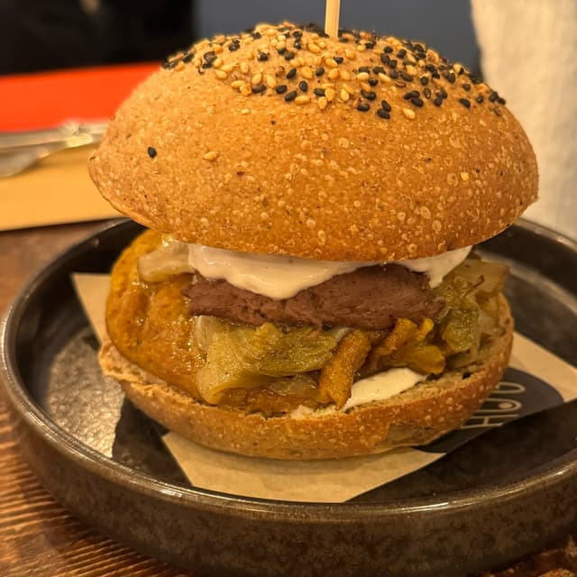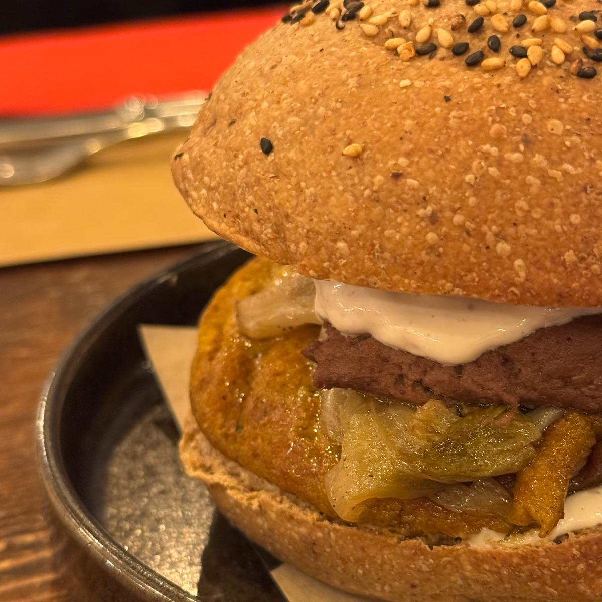 Gustosissimo, il pane è morbido, il sapore ottimo. All’interno burger di zucca, quinoa, porri, topinambur, spezie e salvia, mayo al pepe di sichuan, formaggio fondente a base di anacardi con zafferano e castagne, insalata belga al forno alla noce moscata, provola al radicchio e noci. Un ottimo burger con ingredienti che si sposano alla perfezione.