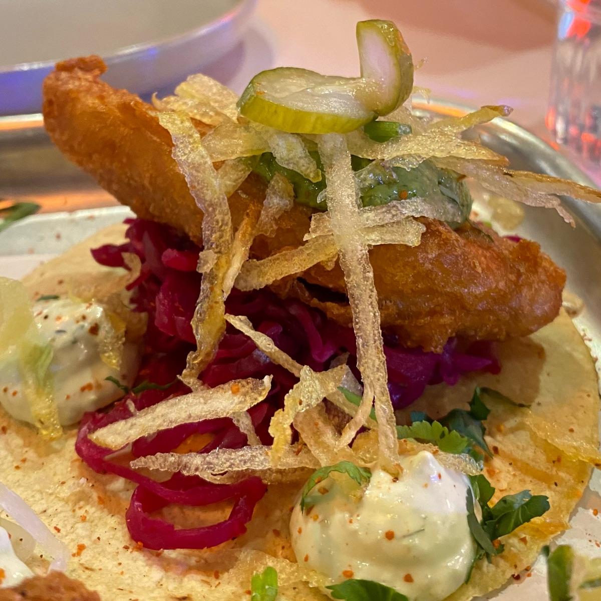 Mi preferido.To-fish rebozado con cerveza, mini papas fritas, col encurtida, salsa tartar, salsa de aguacate y menta y gherkin