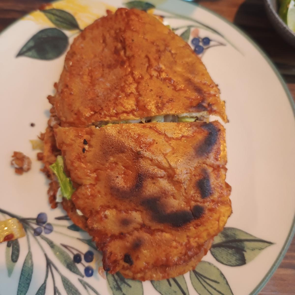Es un #veganpambazo de tamaño normal de telera, no me picó casi, lo cual está perfecto! Yo lo pedí relleno de chorizo (puede ser de cualquier guisado). Me gustó, buen sabor, buen precio $45 (dic-24) porque no encuentras fácil en otros lugares de #garnachas y traía bastante guisado, aunque me hubiera gustado que le hubieran puesto más papas, apenas unas cuantas no es suficiente! También traten lechuga, crema y queso.