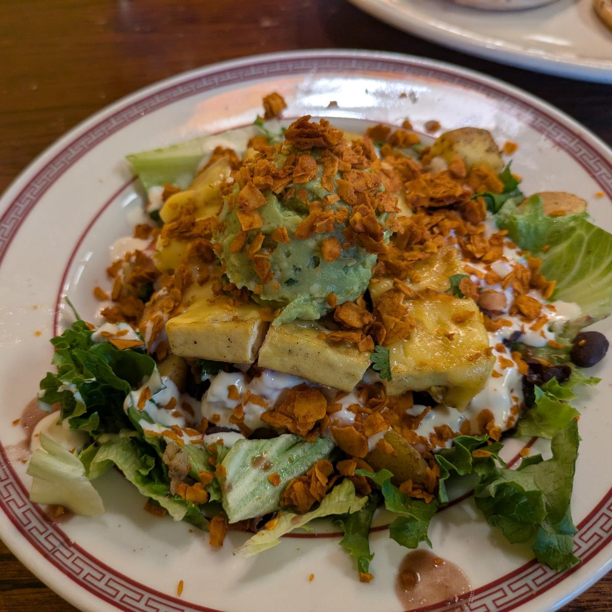 "Cheesy tofu egg on a bed of lettuce, roasted potatoes, black beans, fresh salsa, and topped with guacamole, sour cream, coconut bacon."