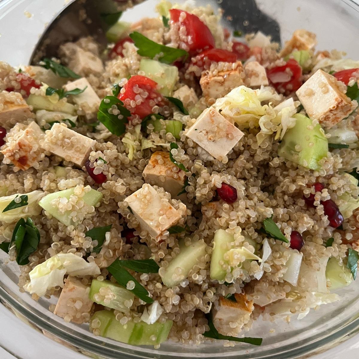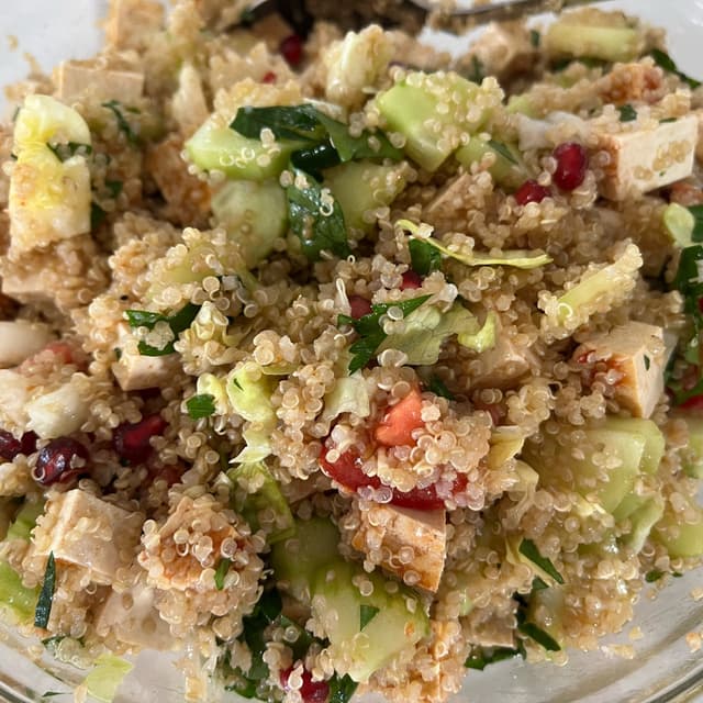 🫛This #sriracha 🌶️ #tofu was ready to eat which is a great #lazyvegan staple to have in the fridge. My partner made this awesome quinoa salad with it with pomegranate seeds, parsley, cucumber, tomatoes, lettuce, and a garlicky mustard dressing. In another version he used avocado too. I can’t remember what this cost. #soy #protein #veganuary2025