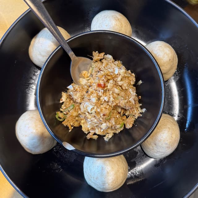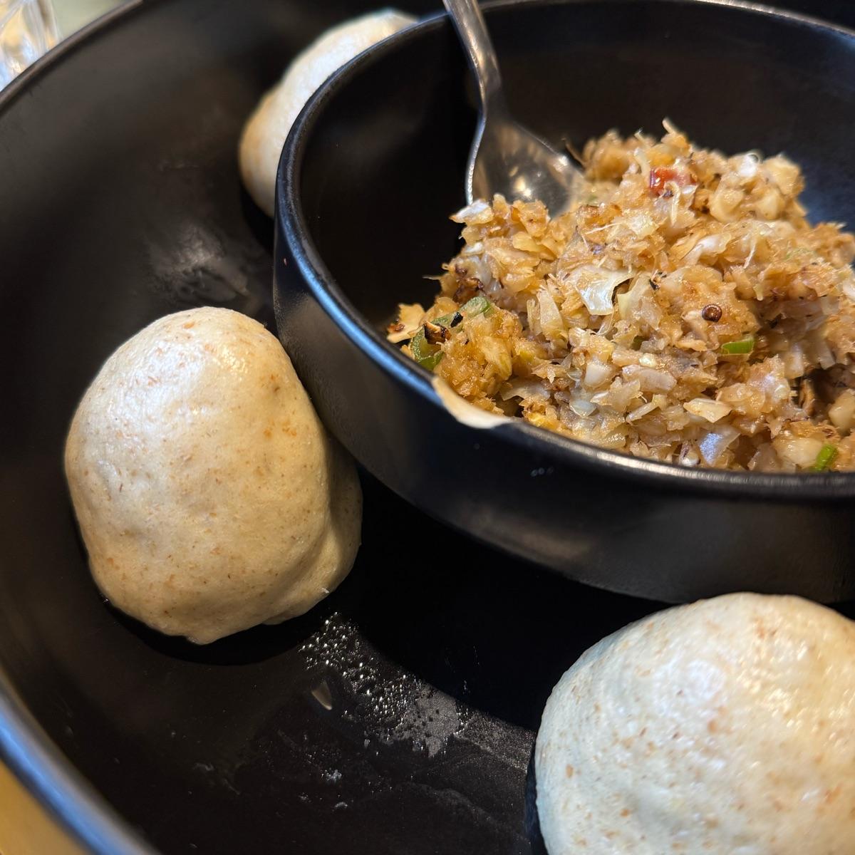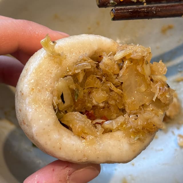 Ottimi! 6 panini fatti con farina integrale, cotti a vapore, serviti con ripieno di verdure fermentate. Il ripieno è buonissimo e leggermente piccante, la consistenza è quella del solito pane cinese. In pratica sono 6 paninetti vuoti da riempire, consiglio di mangiarli subito perché se si raffreddano diventano un pochino stopposi.