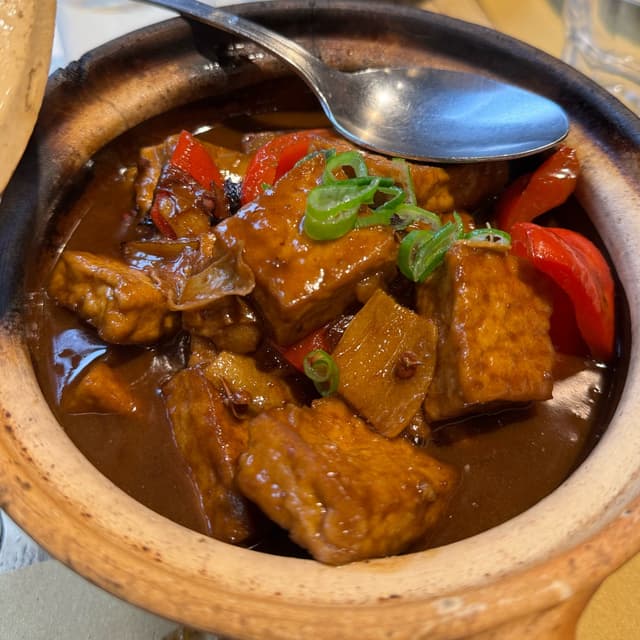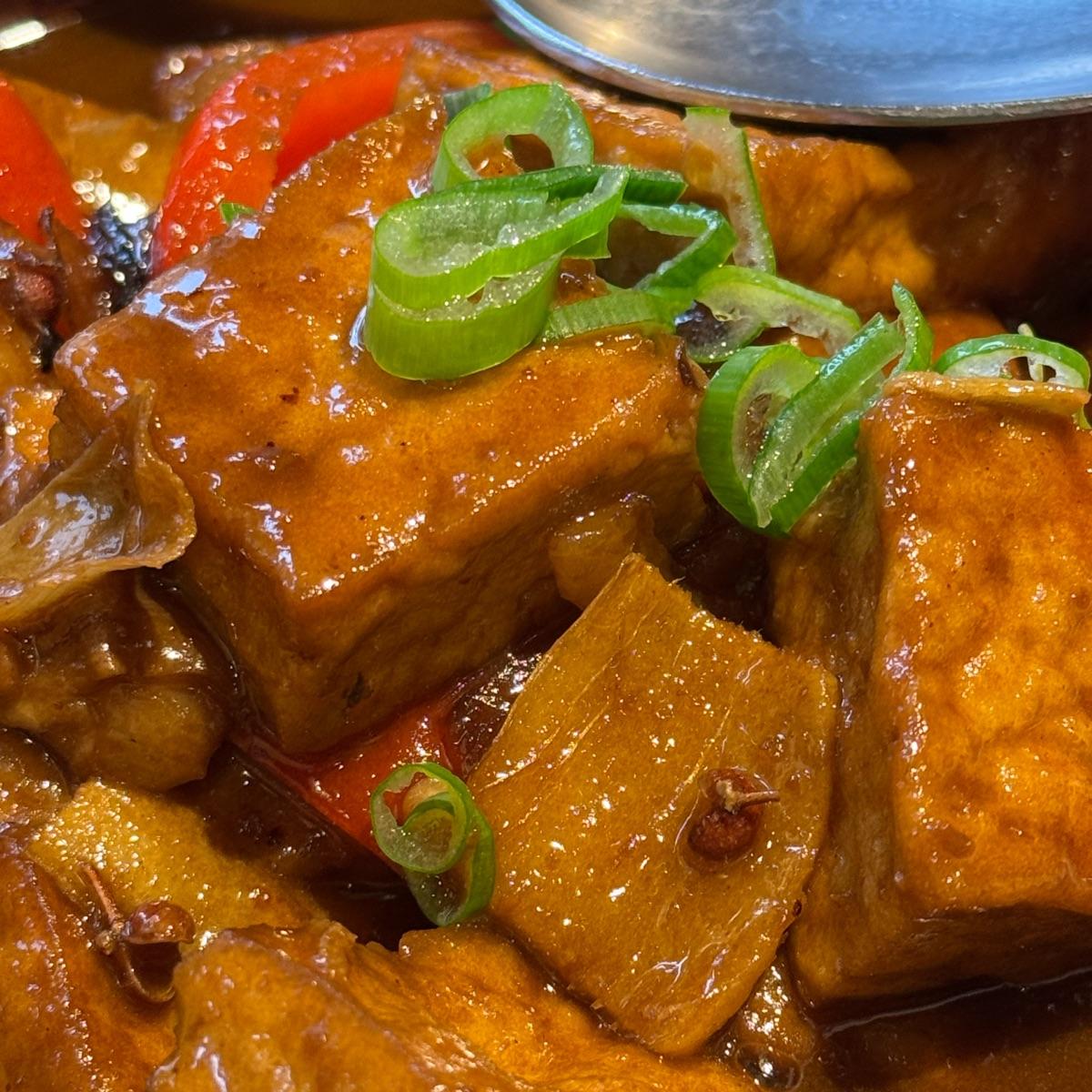 Tofu casereccio stufato in wok con peperone, cipollotto, zenzero e pepe di Sichuan. Buonissimo, mi è piaciuta la consistenza del tofu, piuttosto solida ma comunque morbidina all’interno. Consiglio di prendere del riso bianco a parte per mangiarlo con il sughetto di questo piatto che è superlativo🤩🥹