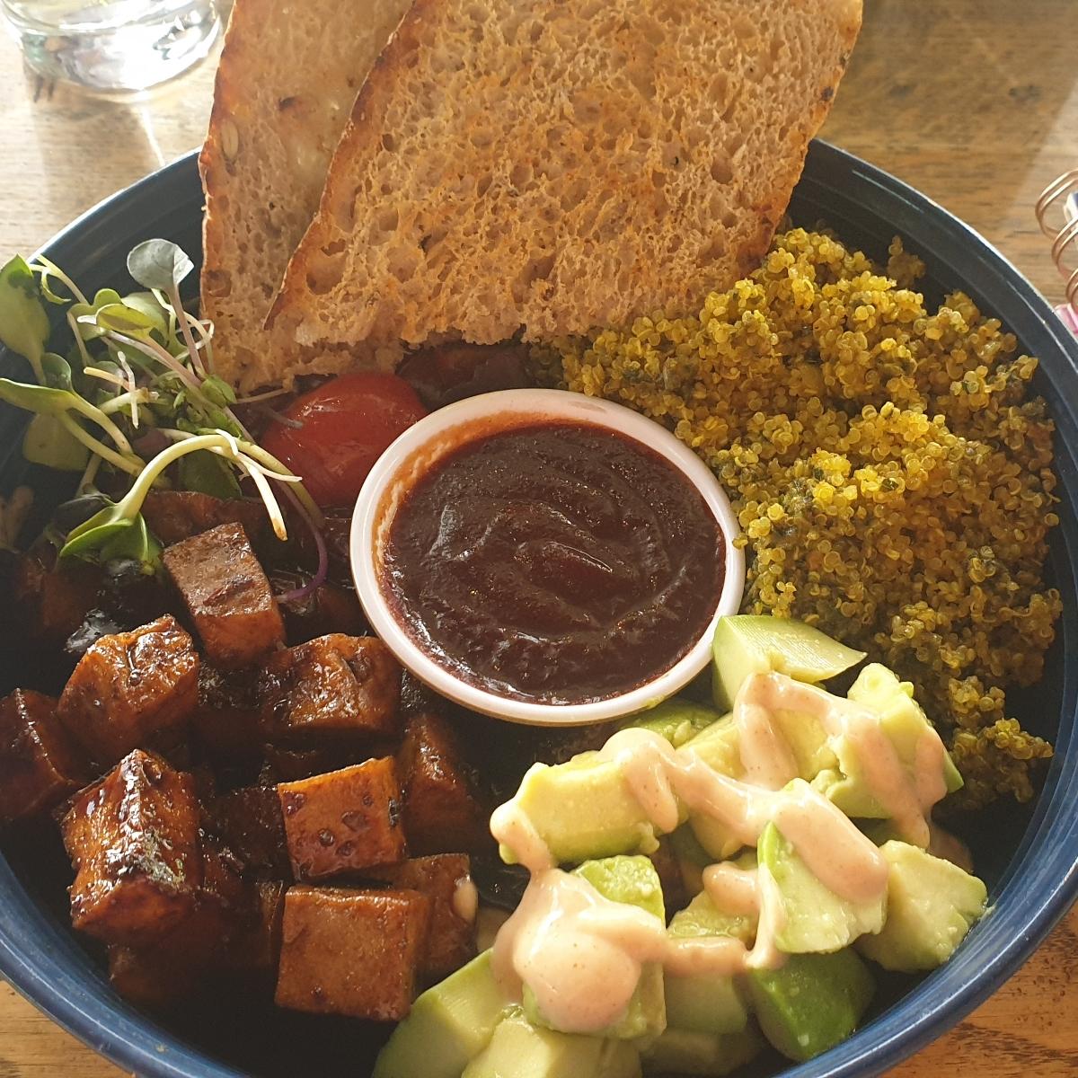 Such a filling breakfast with so many different flavours going on - pesto quinoa, BBQ tofu cubes with extra BBQ sauce, avocado with a mayonnaise drizzle, charred tomatoes and two slices of toast with a side of vegan butter. And some greens.