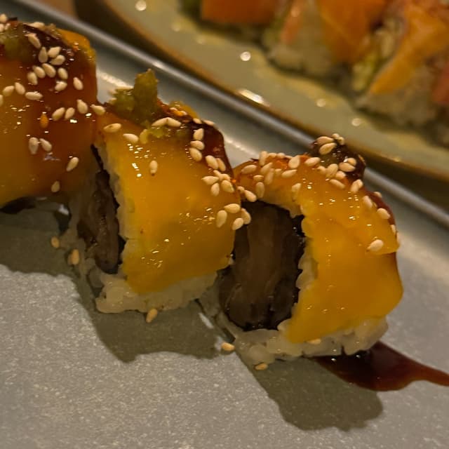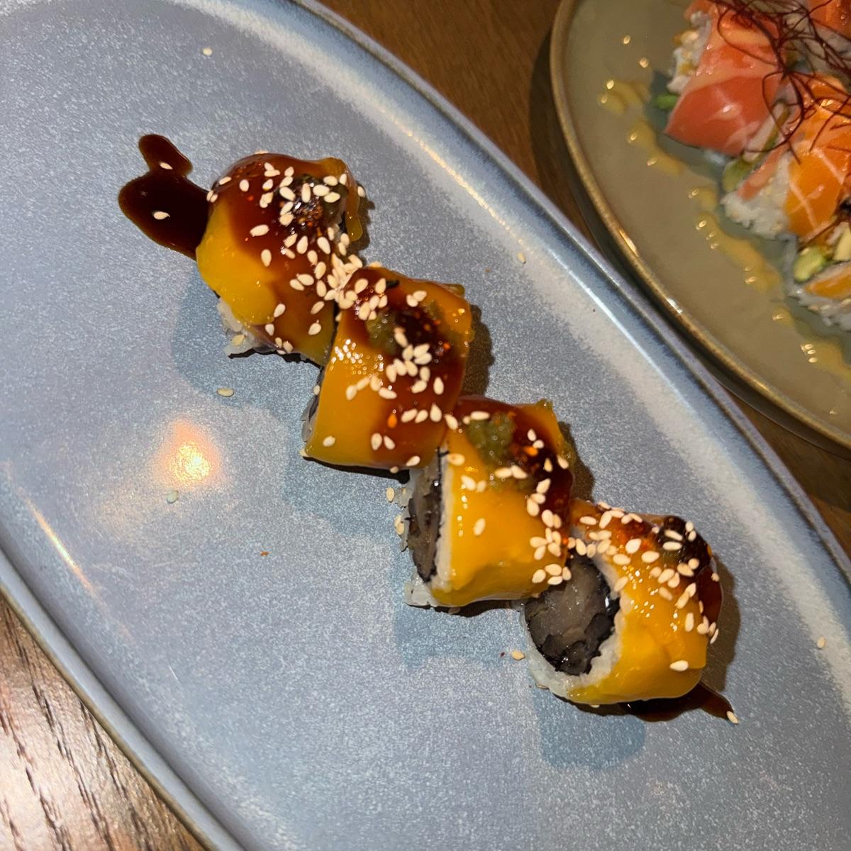 Dolcino, morbido, saporito. Roll con melanzana marinata all’interno, carpaccio di mango, yuzukosho, salsa teriyaki e sesamo bianco, davvero gustoso. 7,5€💰
