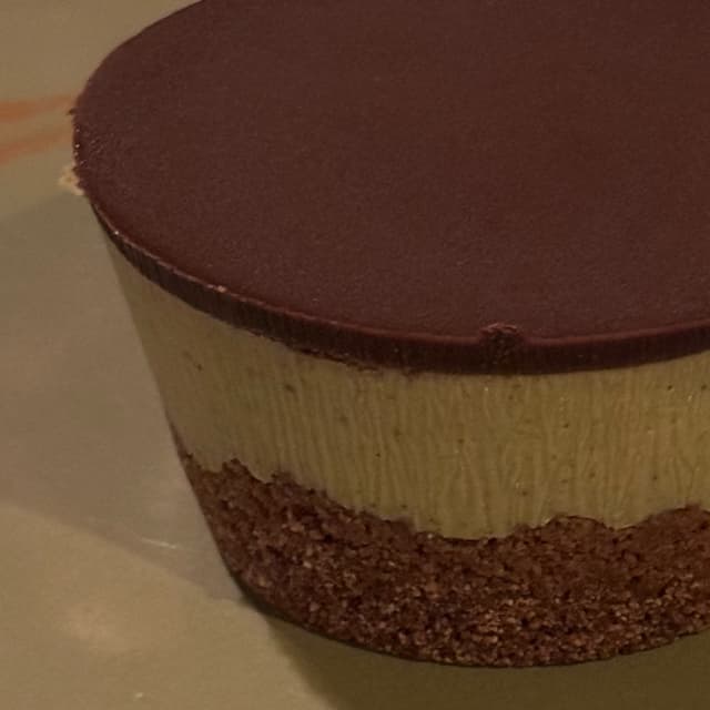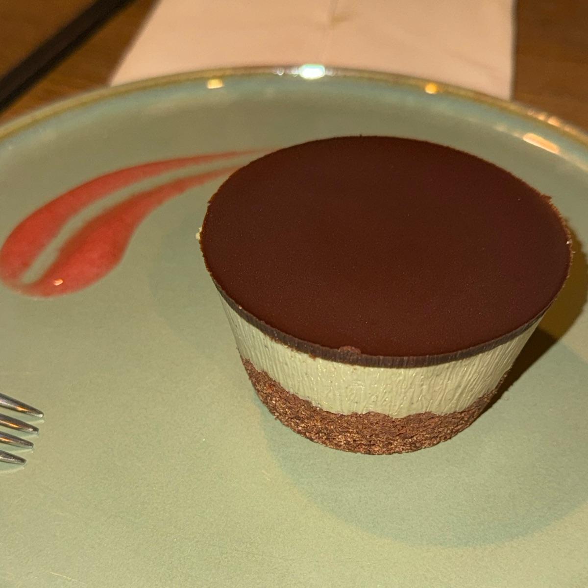 Tortino del giorno, un dessert al macha e topping cioccolato. Buono! Consistenze perfette: morbidissima la parte al tè verde macha (si sentiva molto il sapore🤩), una lastra croccante di cioccolato e il biscotto stile cheesecake come base, farinoso che si scioglie in bocca. Promosso!